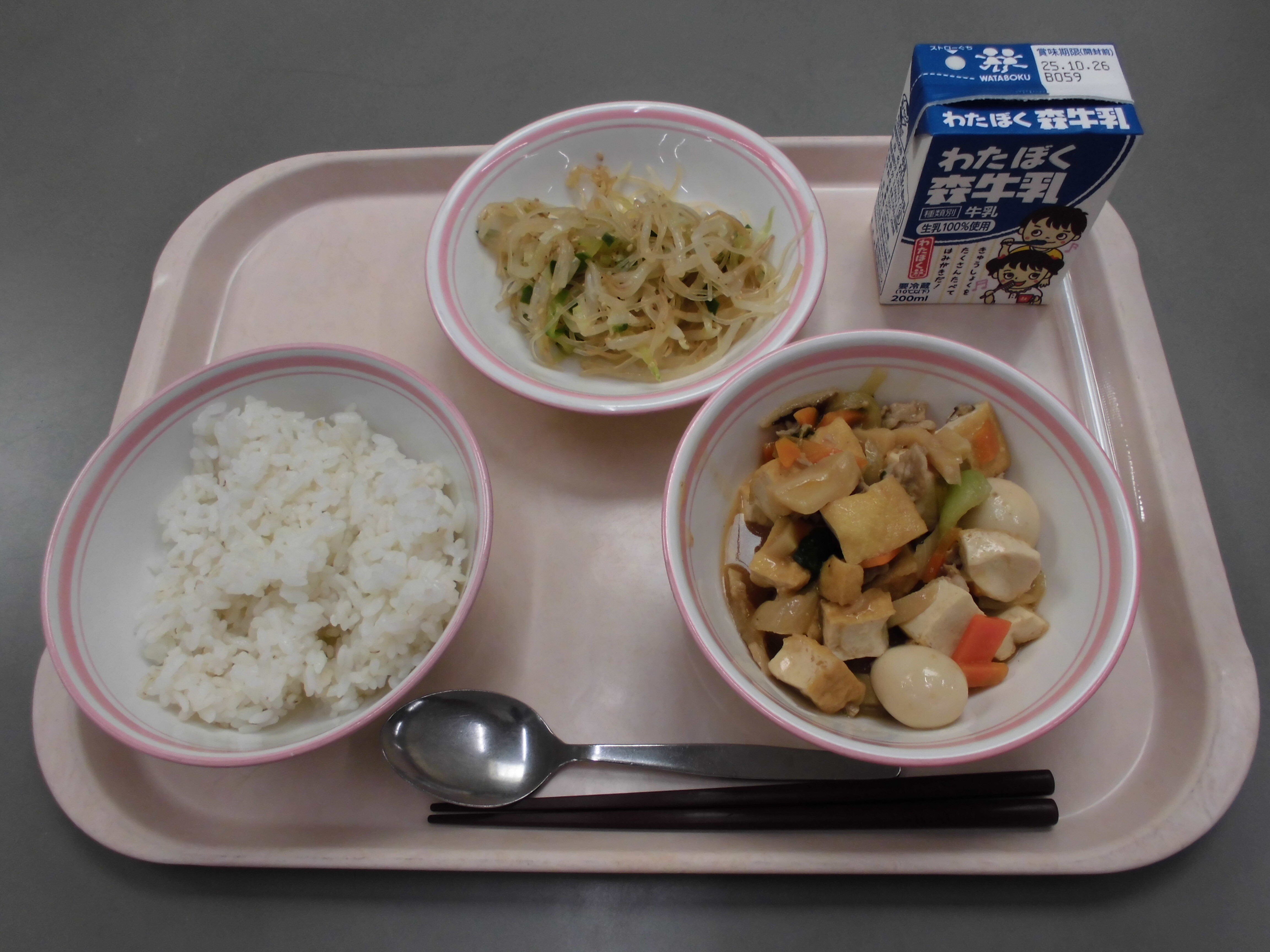 麦ご飯、生揚げとうずら卵の中華煮、春雨サラダ、牛乳