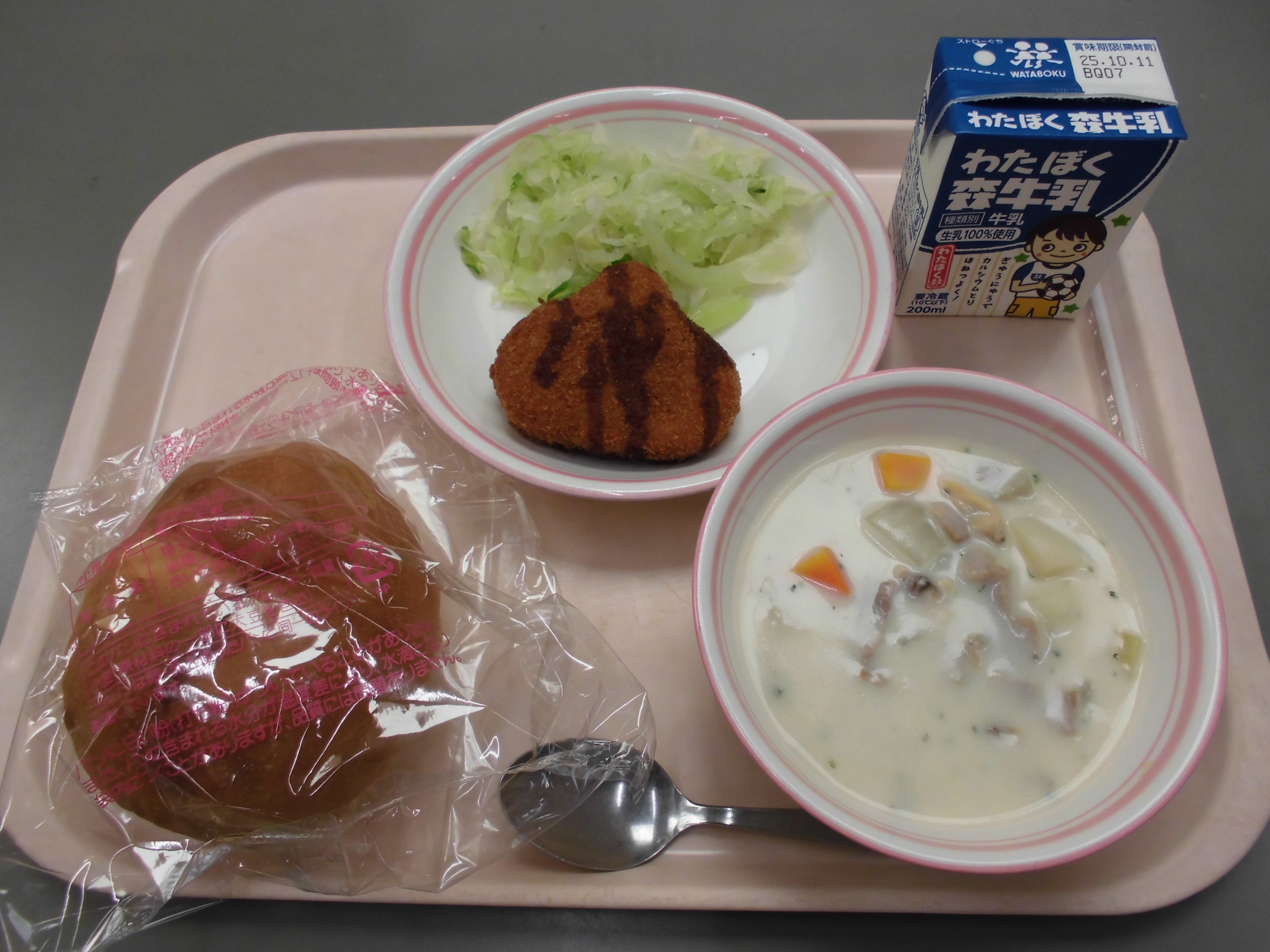 子どもパン、焼き栗コロッケ、クラムチャウダー、せんキャベツ、牛乳