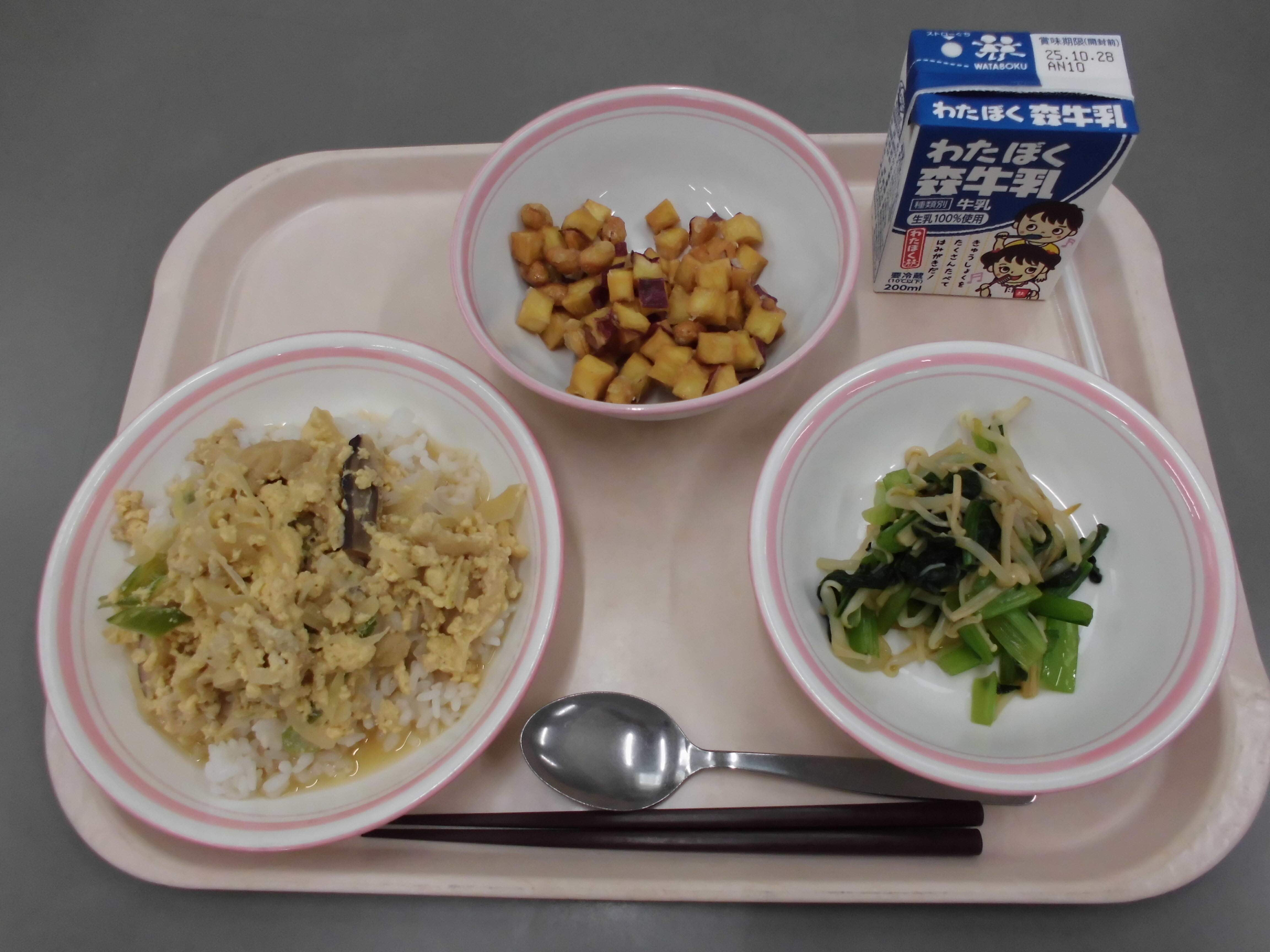 きつね丼(麦ご飯)、芋と豆のかりんとう、おひたし、牛乳