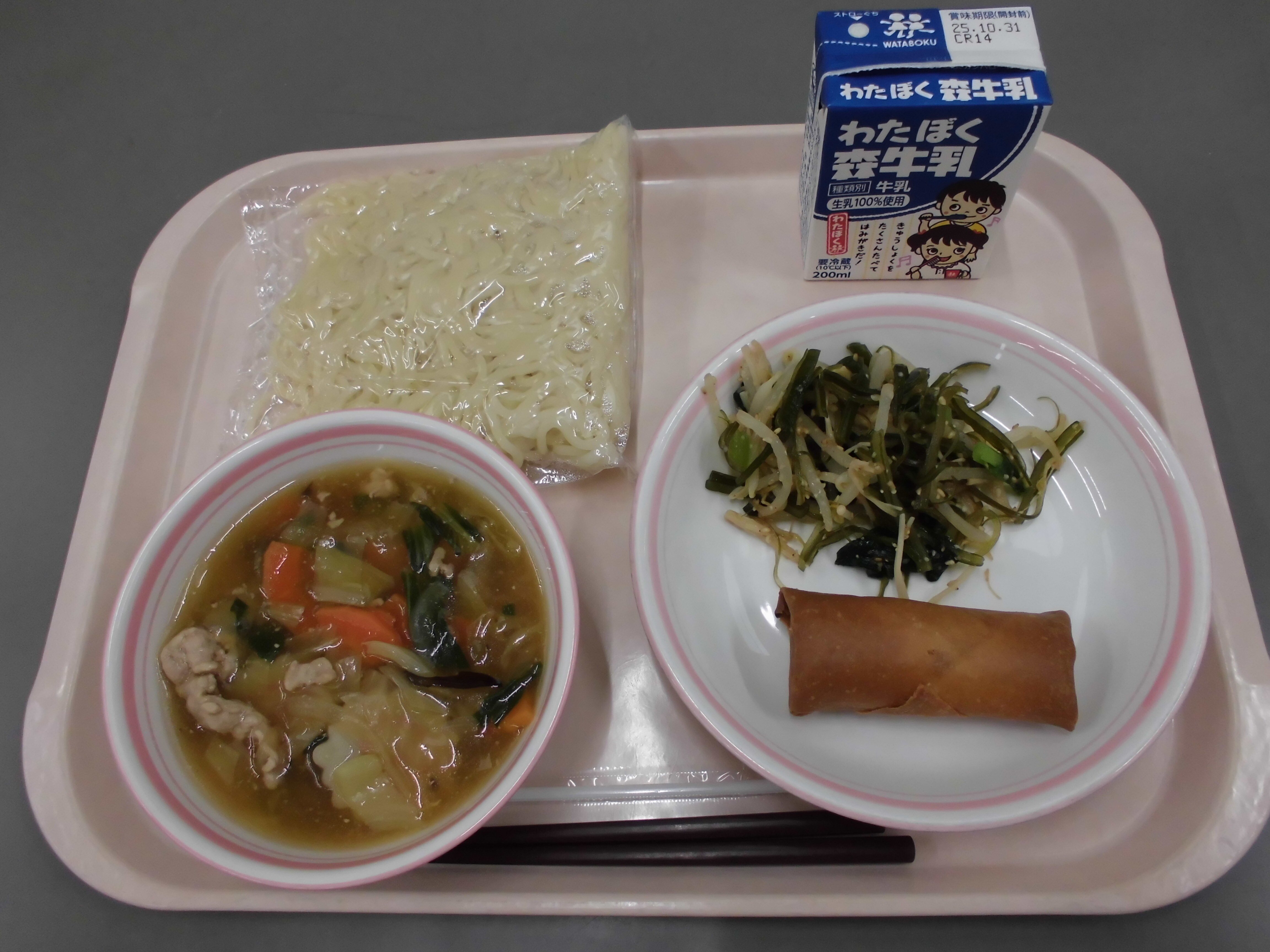 あんかけラーメン(中華めん)、春巻き、茎わかめのサラダ、牛乳