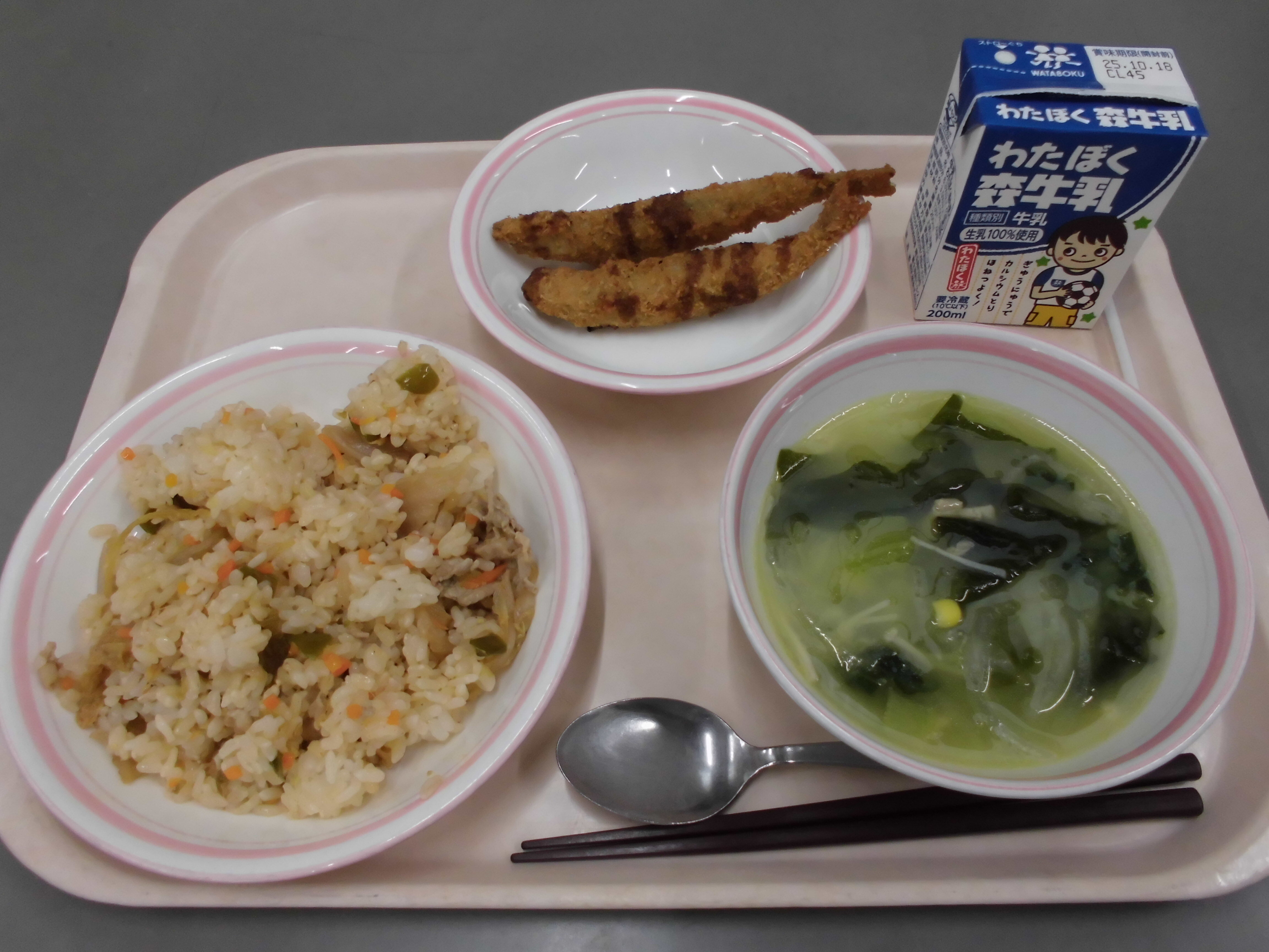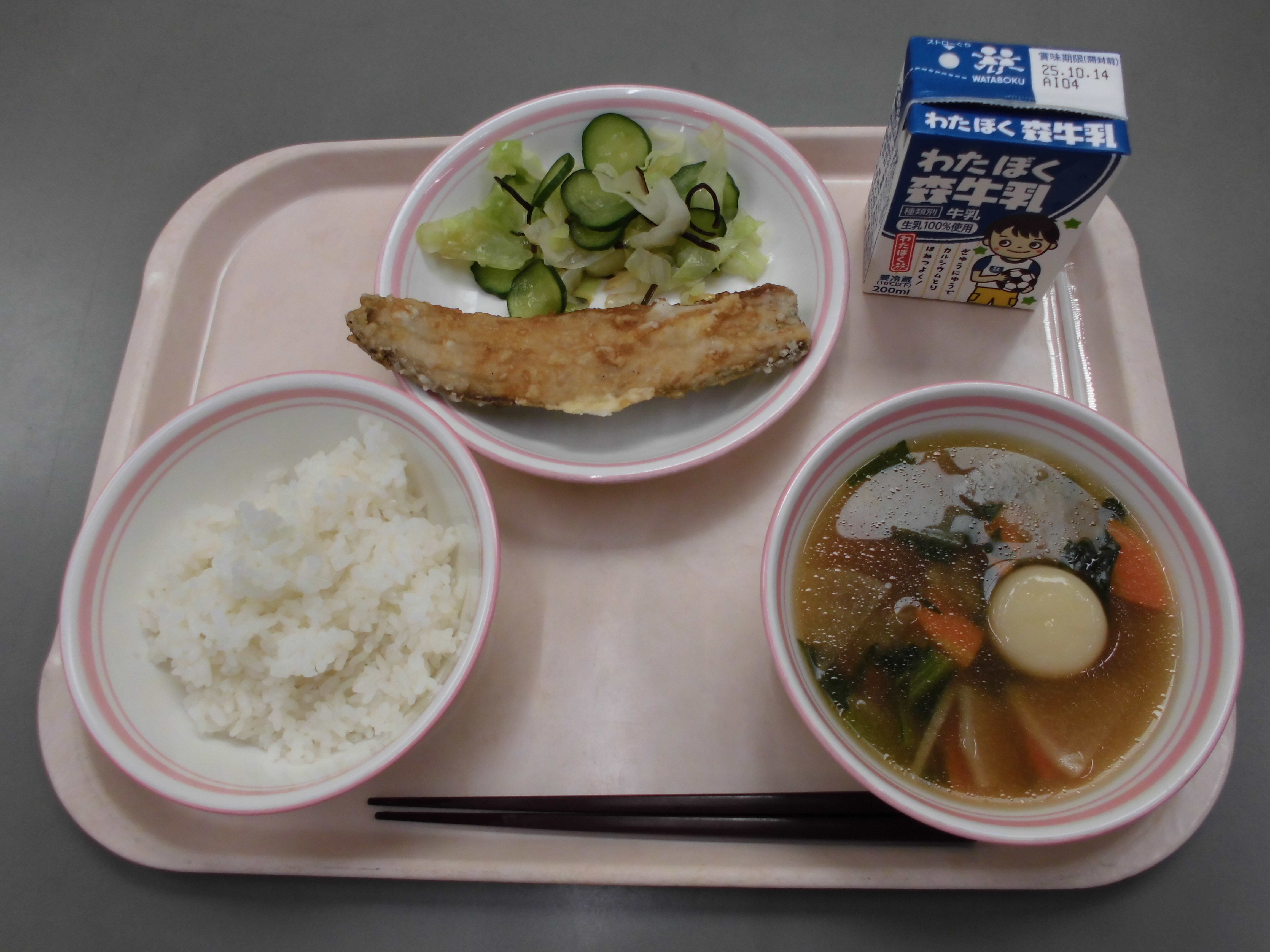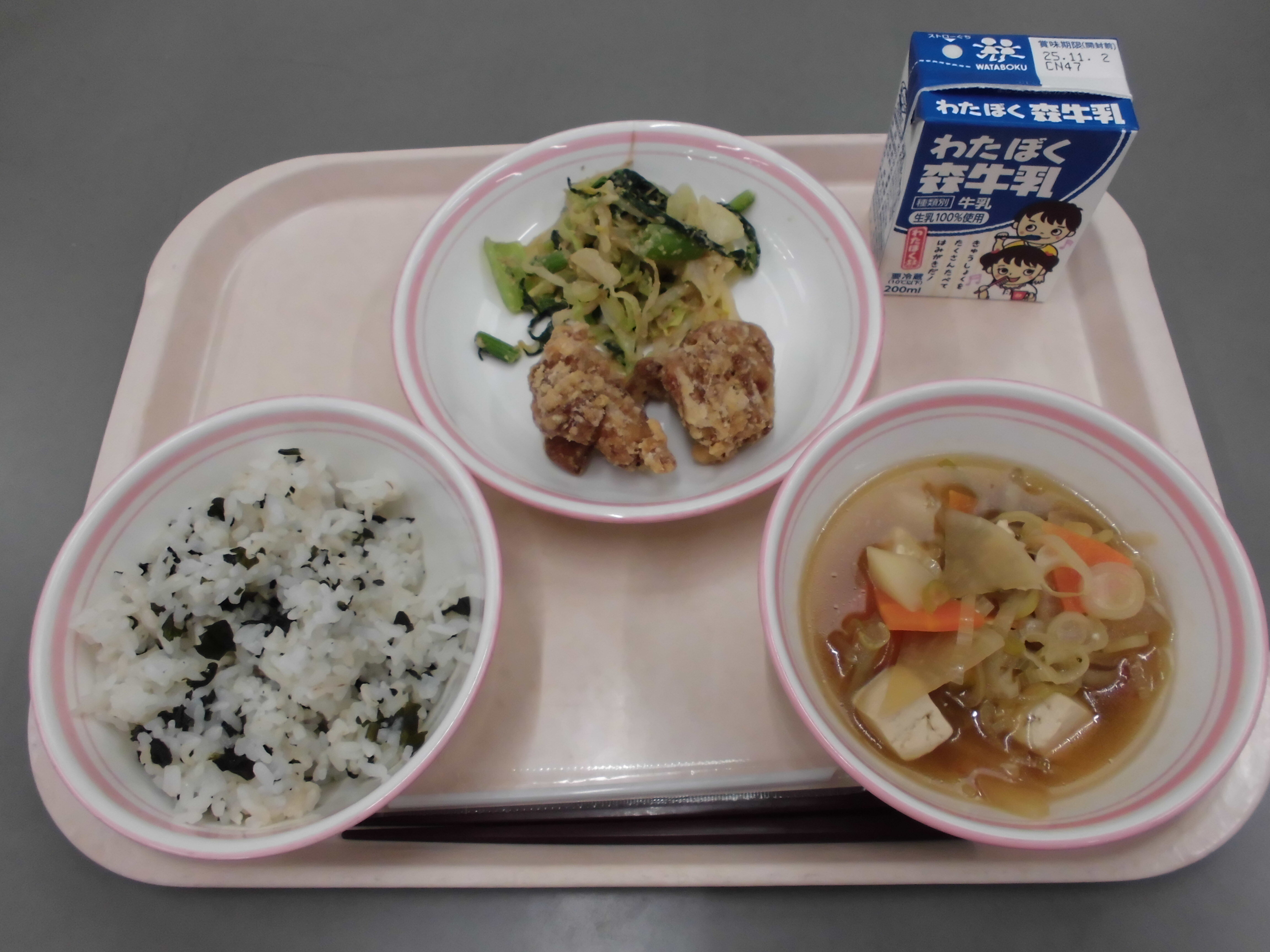 わかめご飯、鶏肉の唐揚げ、けんちん汁、ごま和え、牛乳