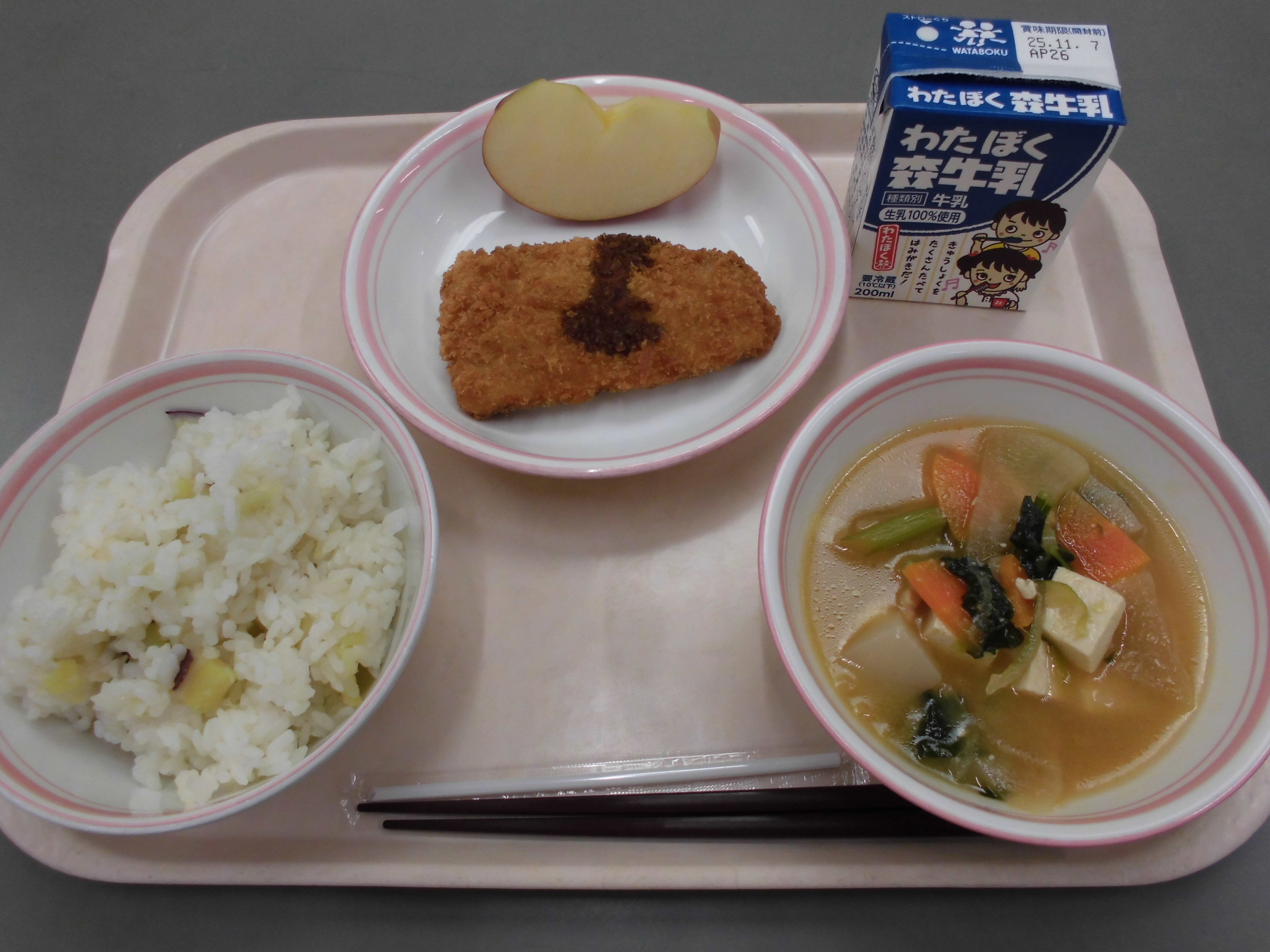 さつま芋ご飯、いわしフライ、呉汁、りんご、牛乳