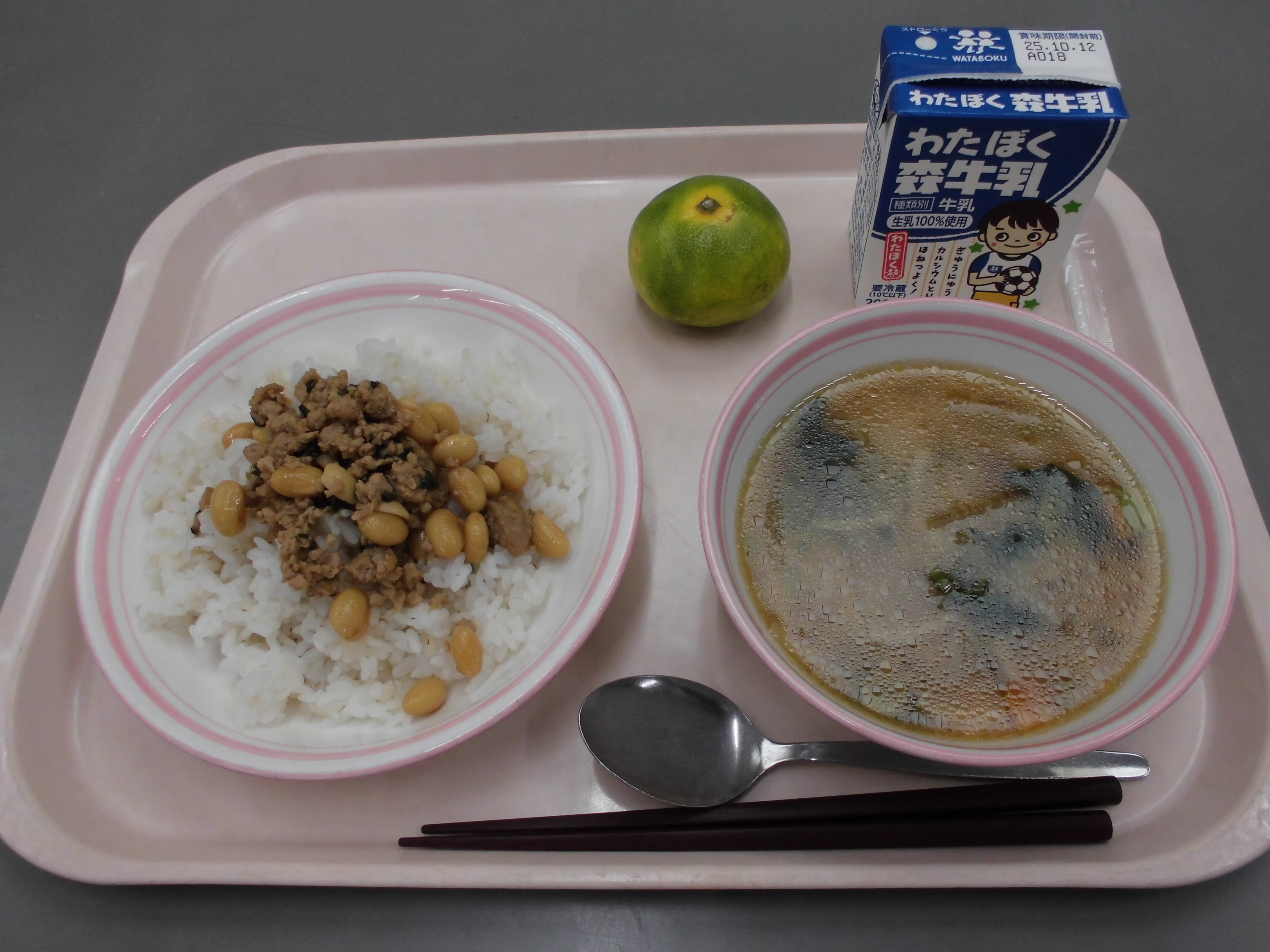 ソイ丼(麦ご飯)、根菜汁、みかん、牛乳