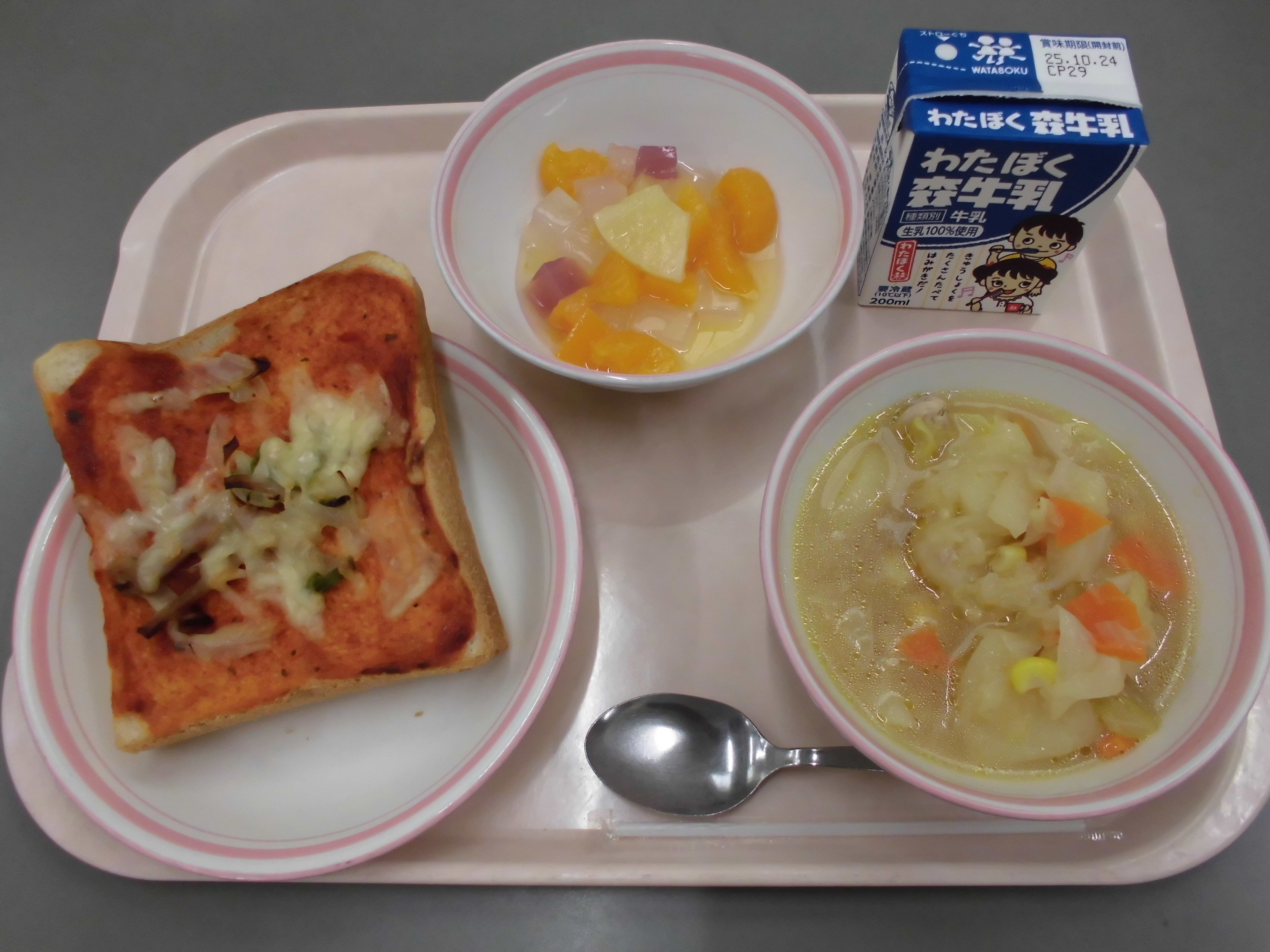 ピザトースト、じゃが芋のスープ煮、フルーツミックス、牛乳