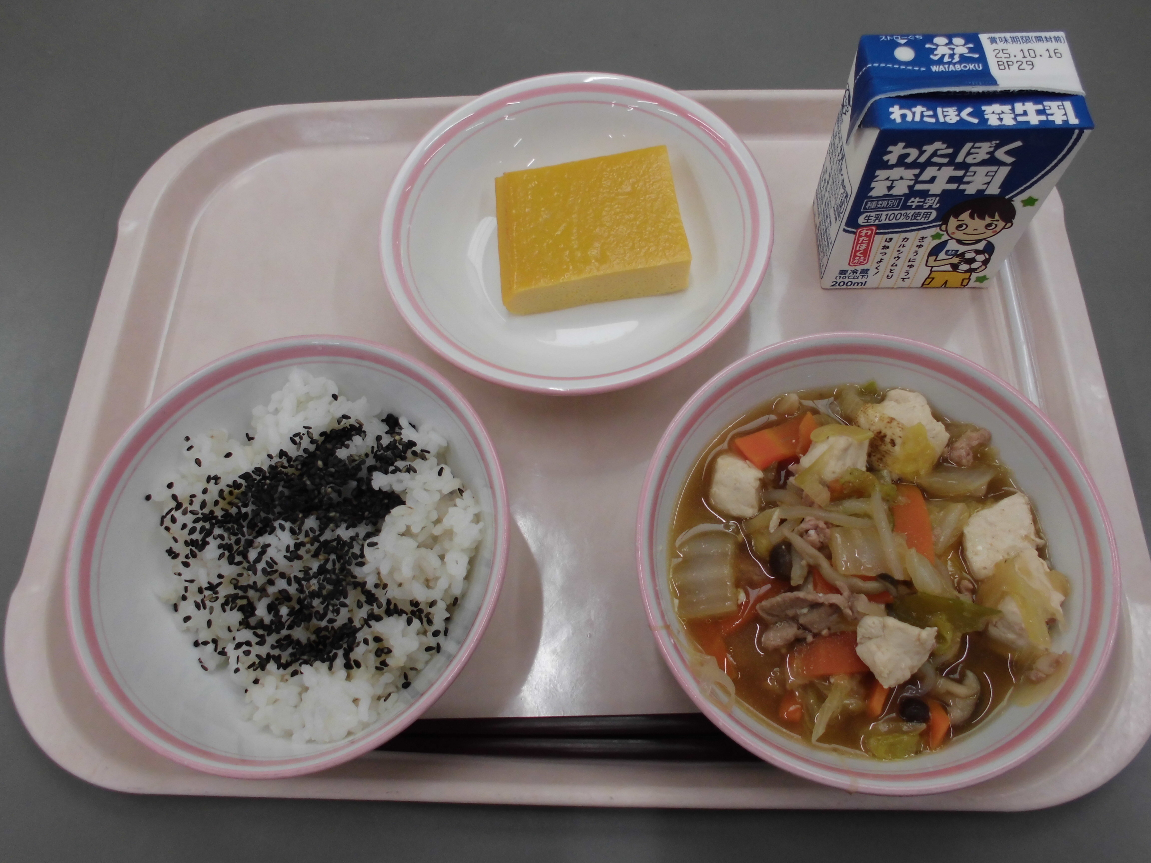 麦ご飯、ごま塩、だし巻き卵、すき焼き風煮、牛乳