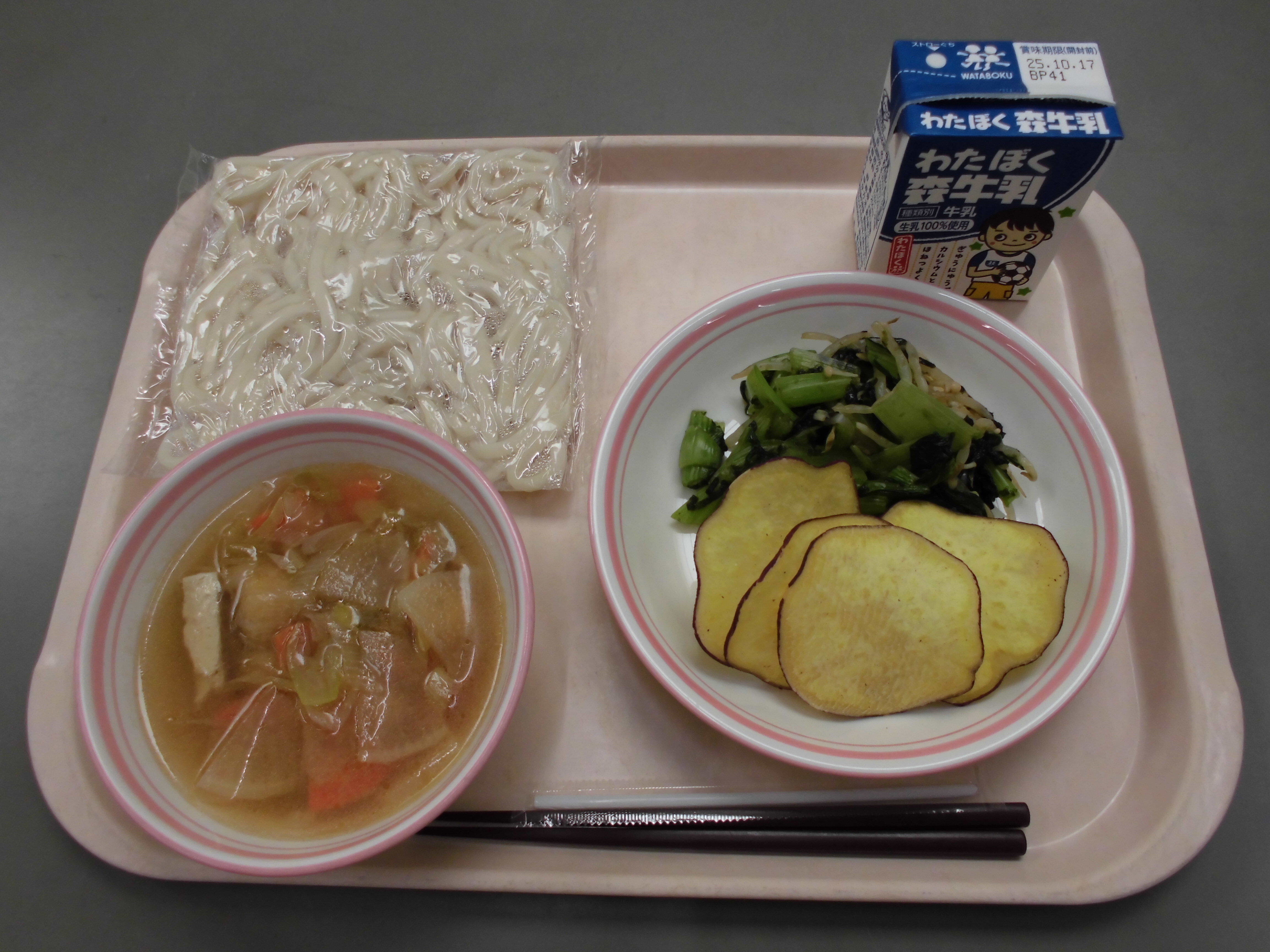 鶏ねぎうどん(地粉うどん)、さつまいもチップス、磯香和え、牛乳