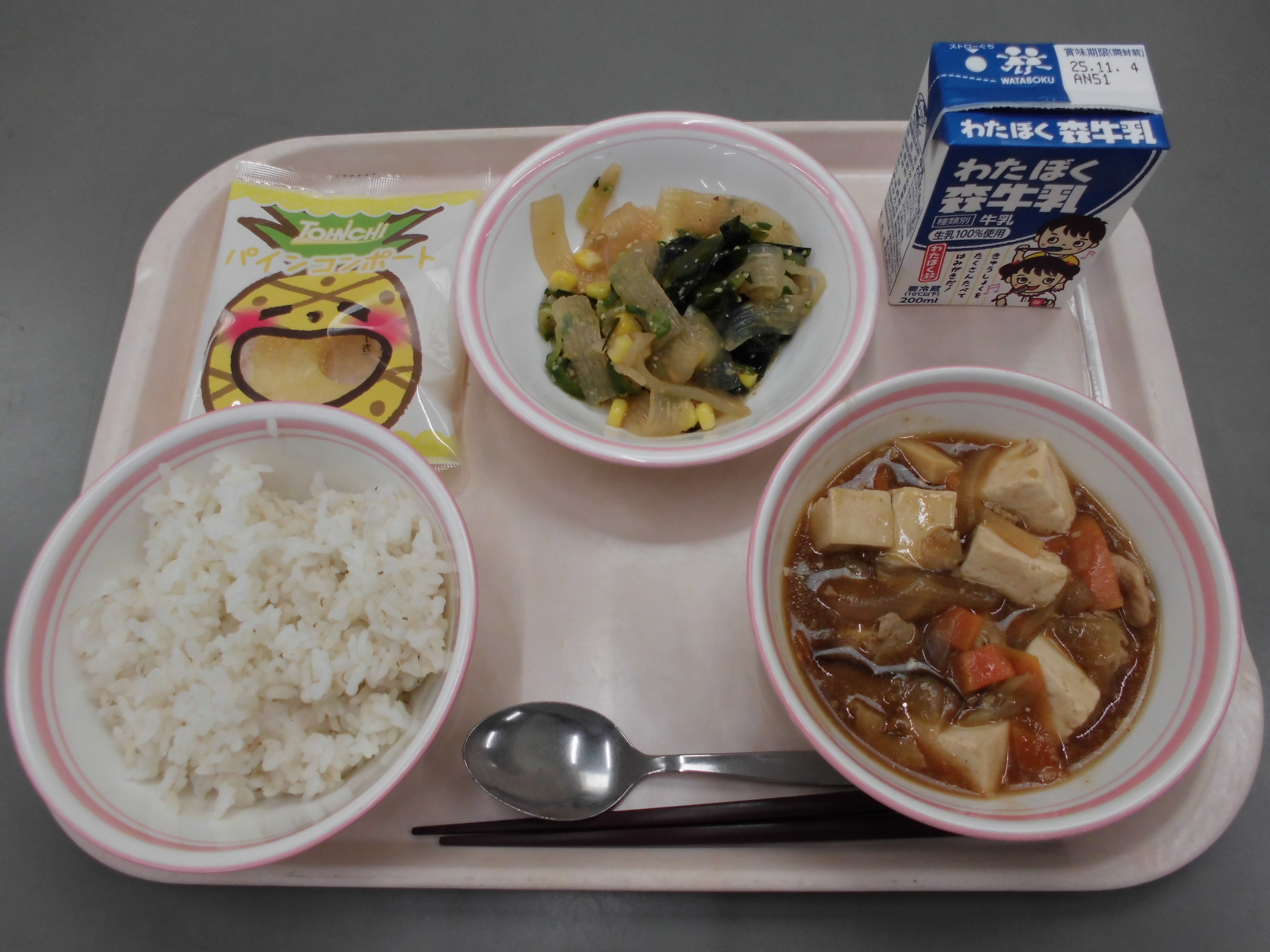 麦ご飯、四川豆腐、こんにゃくサラダ、パイナップル、牛乳