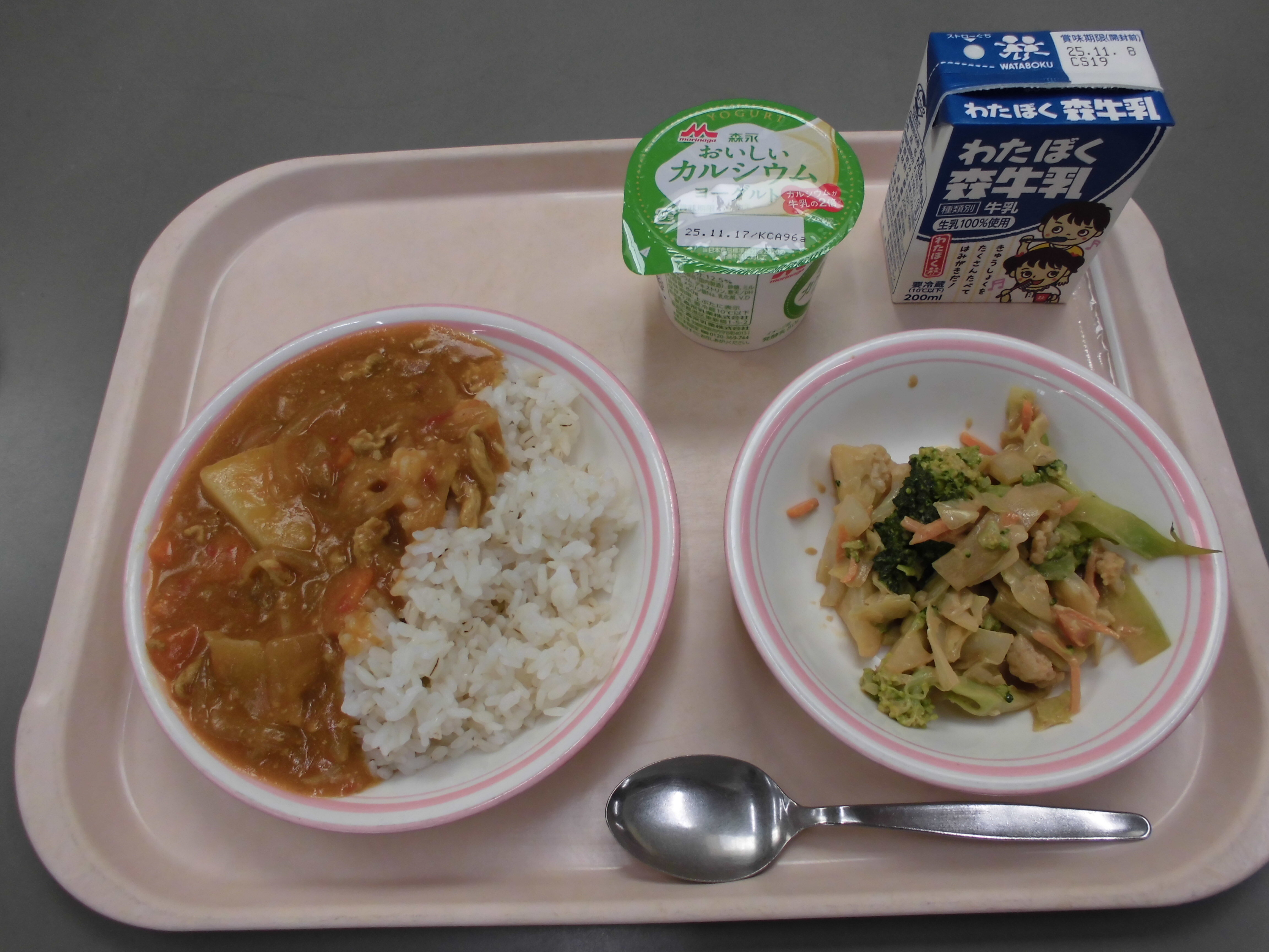 ポークカレー(麦ご飯)、つぼみサラダ、ヨーグルト、牛乳