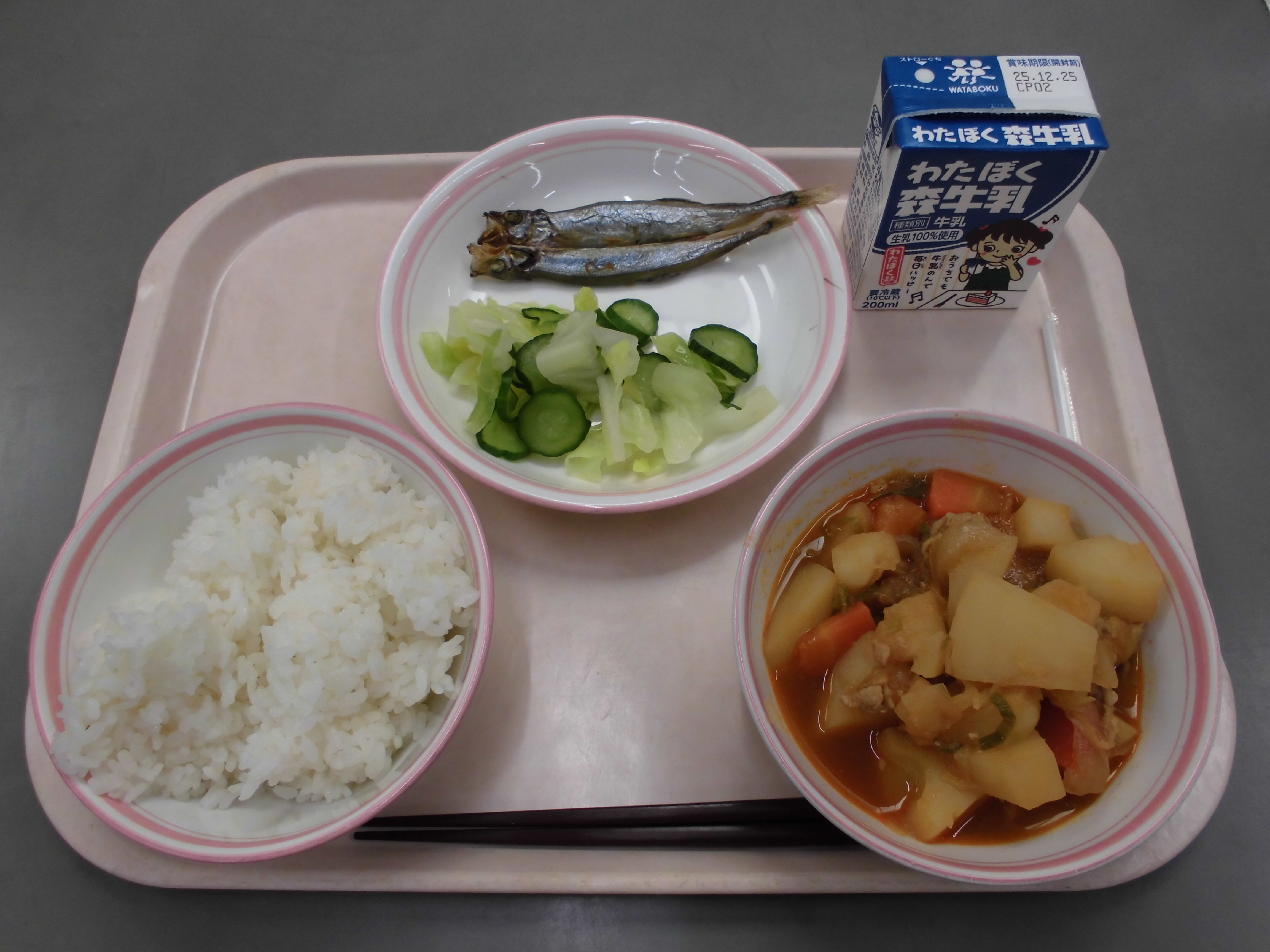カレーには冬が旬の里芋とブロッコリーが入っています。オムレツは玉ねぎをじっくり炒めて作ったトマトソースを合わせました。給食が終わると「今日は4回おかわりしたよ!」と教えてくれた児童がいて、うれしかったです。
