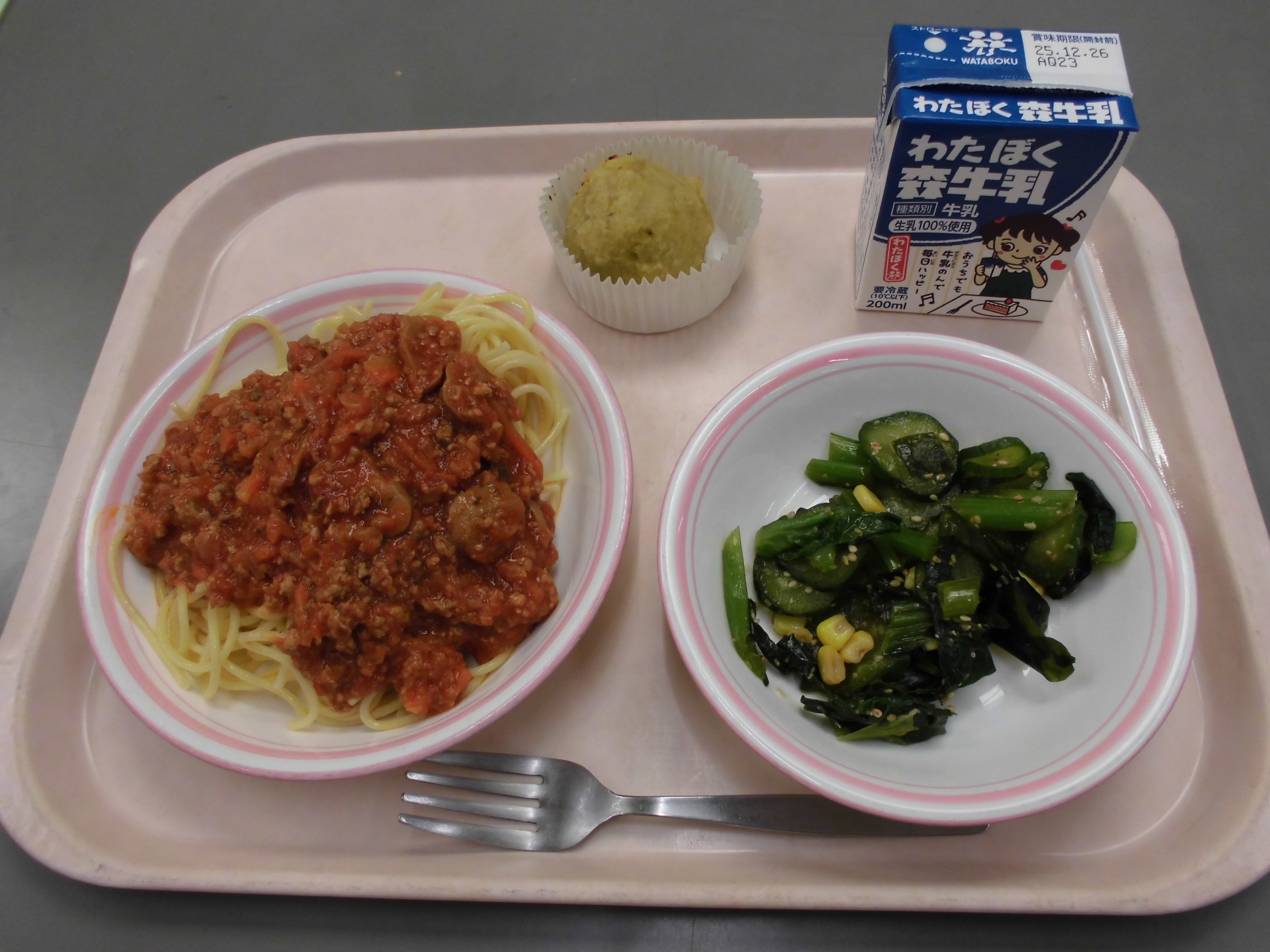 ミートソーススパゲティ、小松菜のサラダ、手作りスイートポテト、牛乳