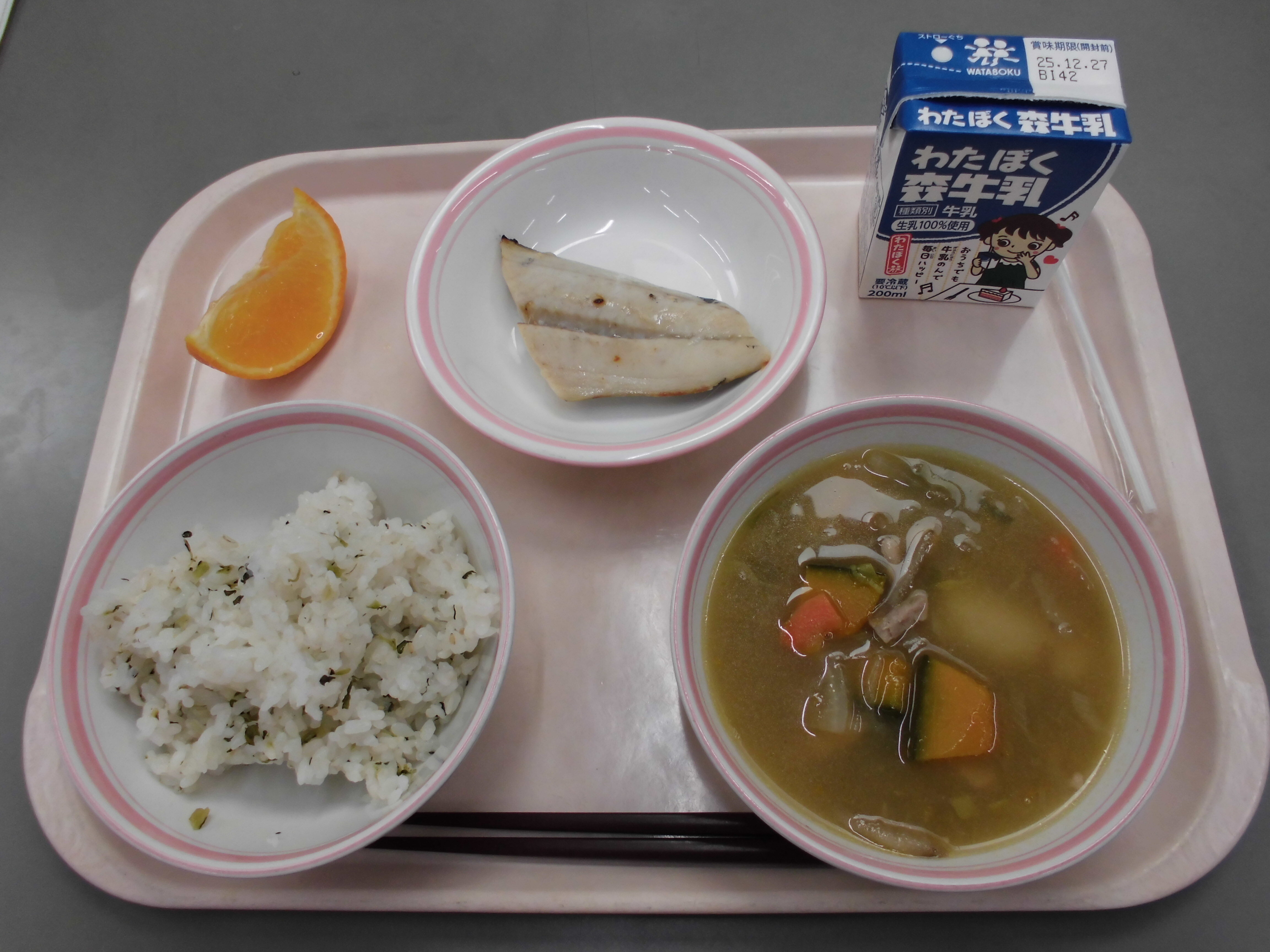 菜飯、さわらのゆず麹焼き、かぼちゃ入りすいとん、夢オレンジ、牛乳