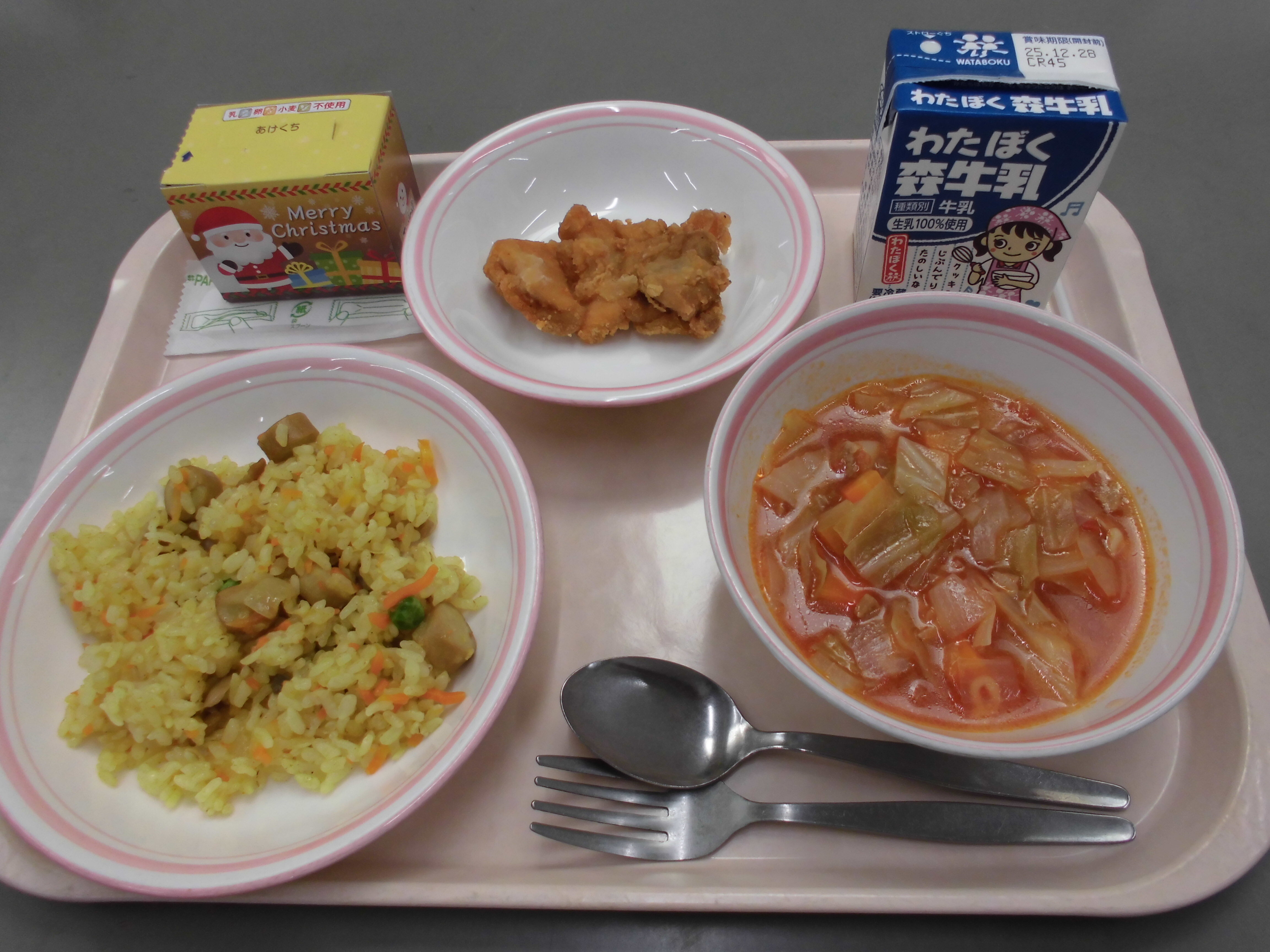 カレーピラフ、フライドチキン、ABCミネストローネ、セレクトデザート、牛乳