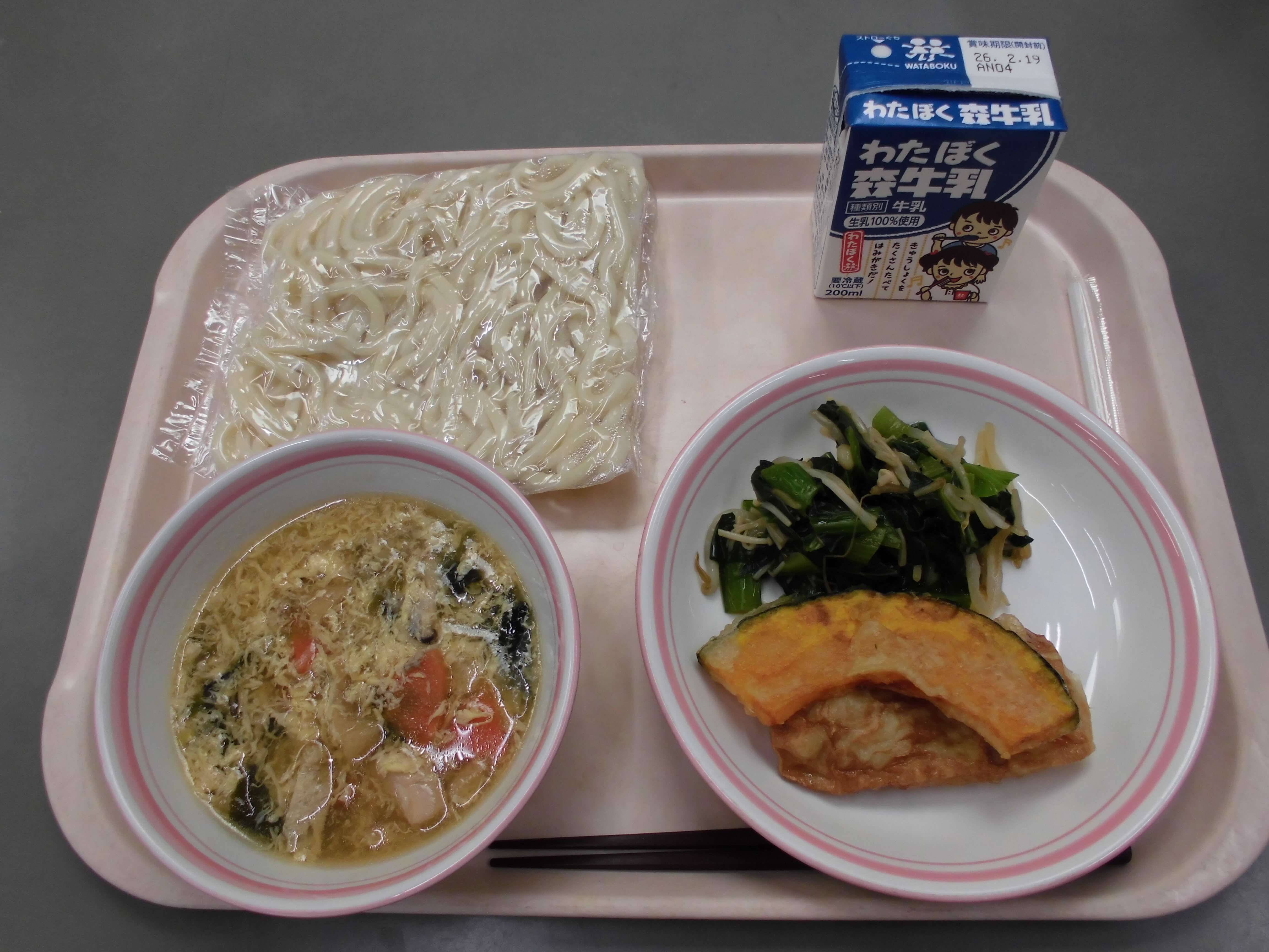 かきたまうどん(地粉うどん)、二色天ぷら(竹輪・かぼちゃ)、おひたし、牛乳