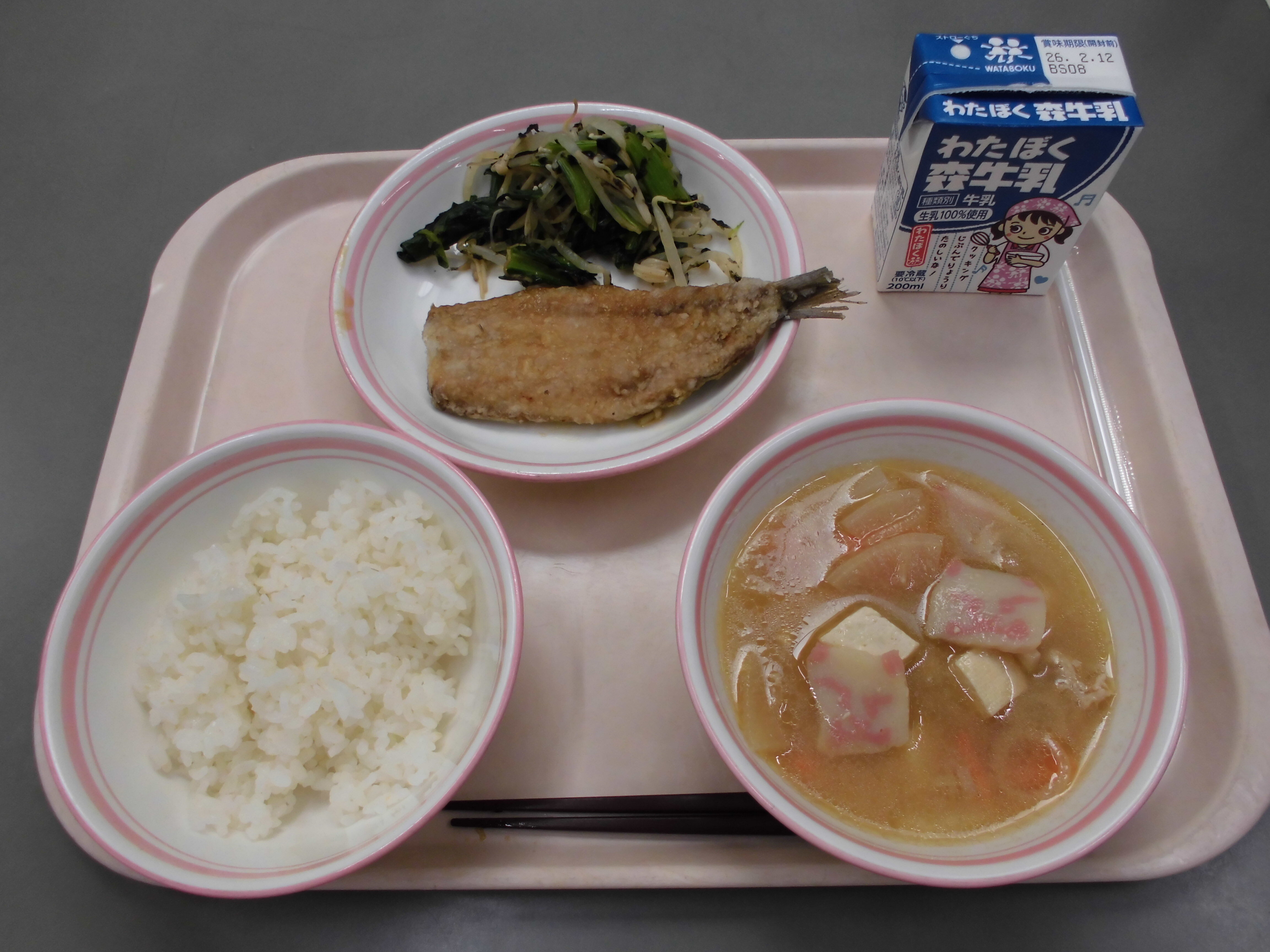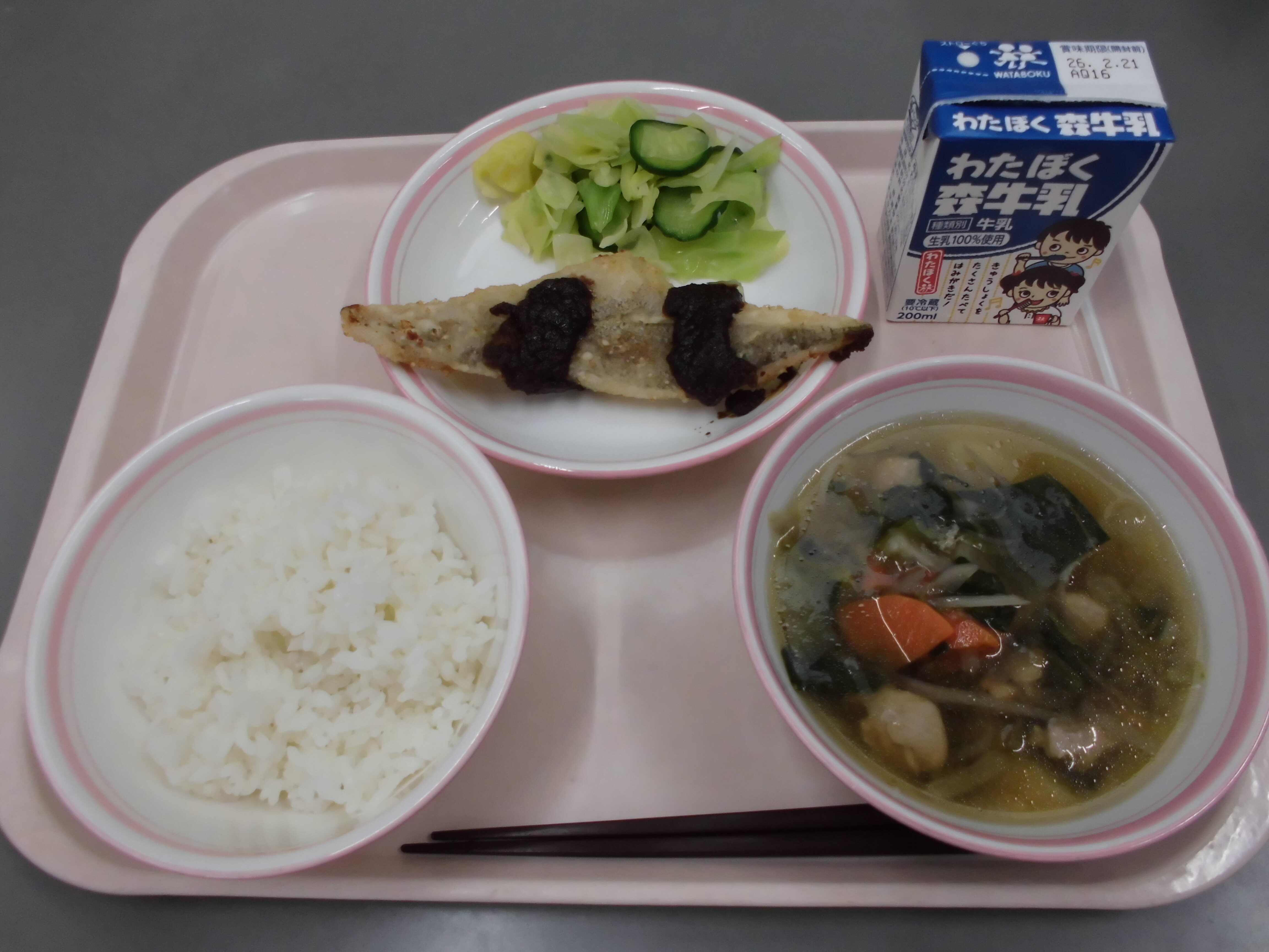 岩槻のご飯(コシヒカリ)、いわしのかば焼き、節分汁、磯香和え、牛乳