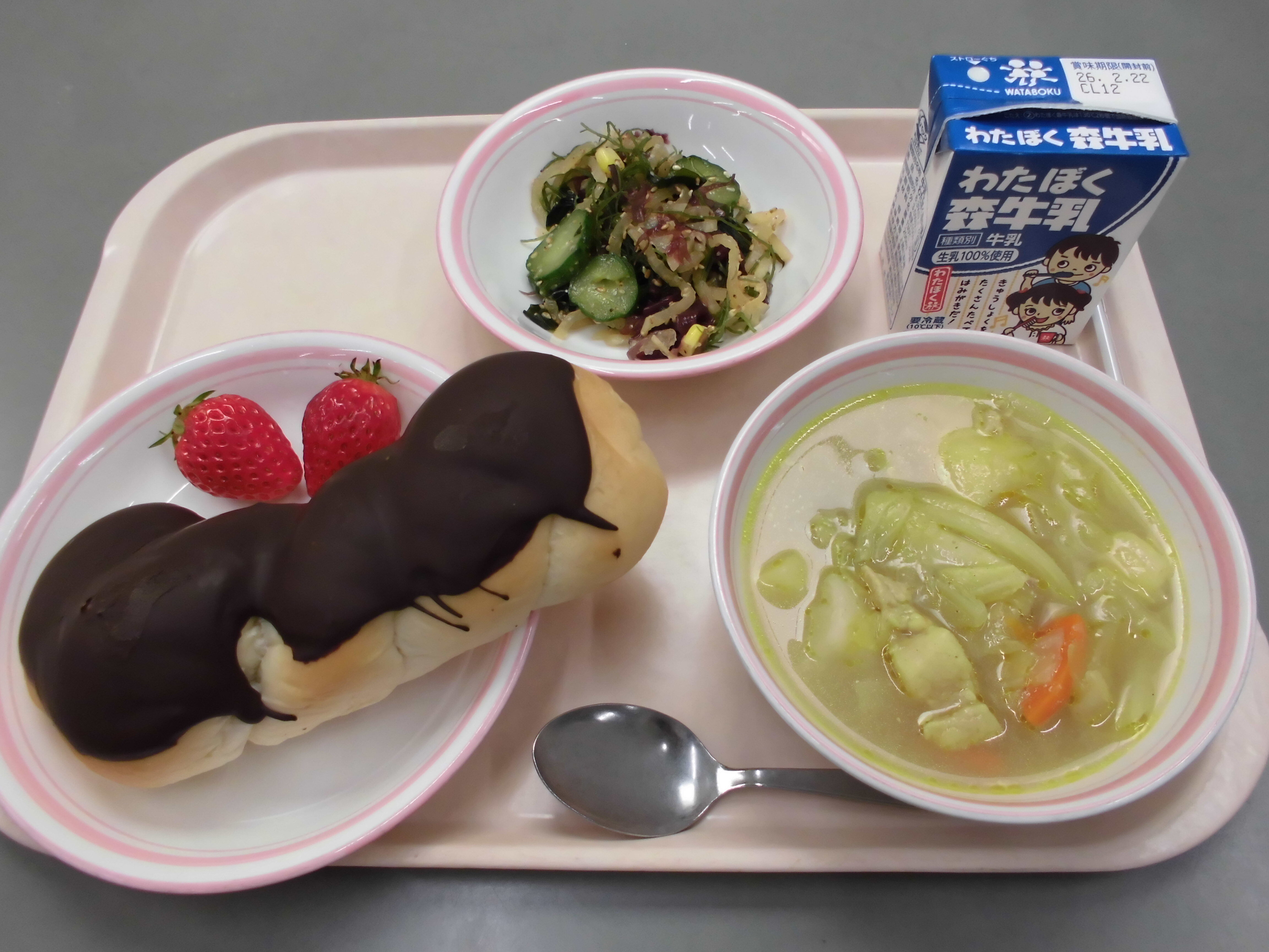 チョコツイストパン、カレー風味ポトフ、海藻サラダ、いちご、牛乳