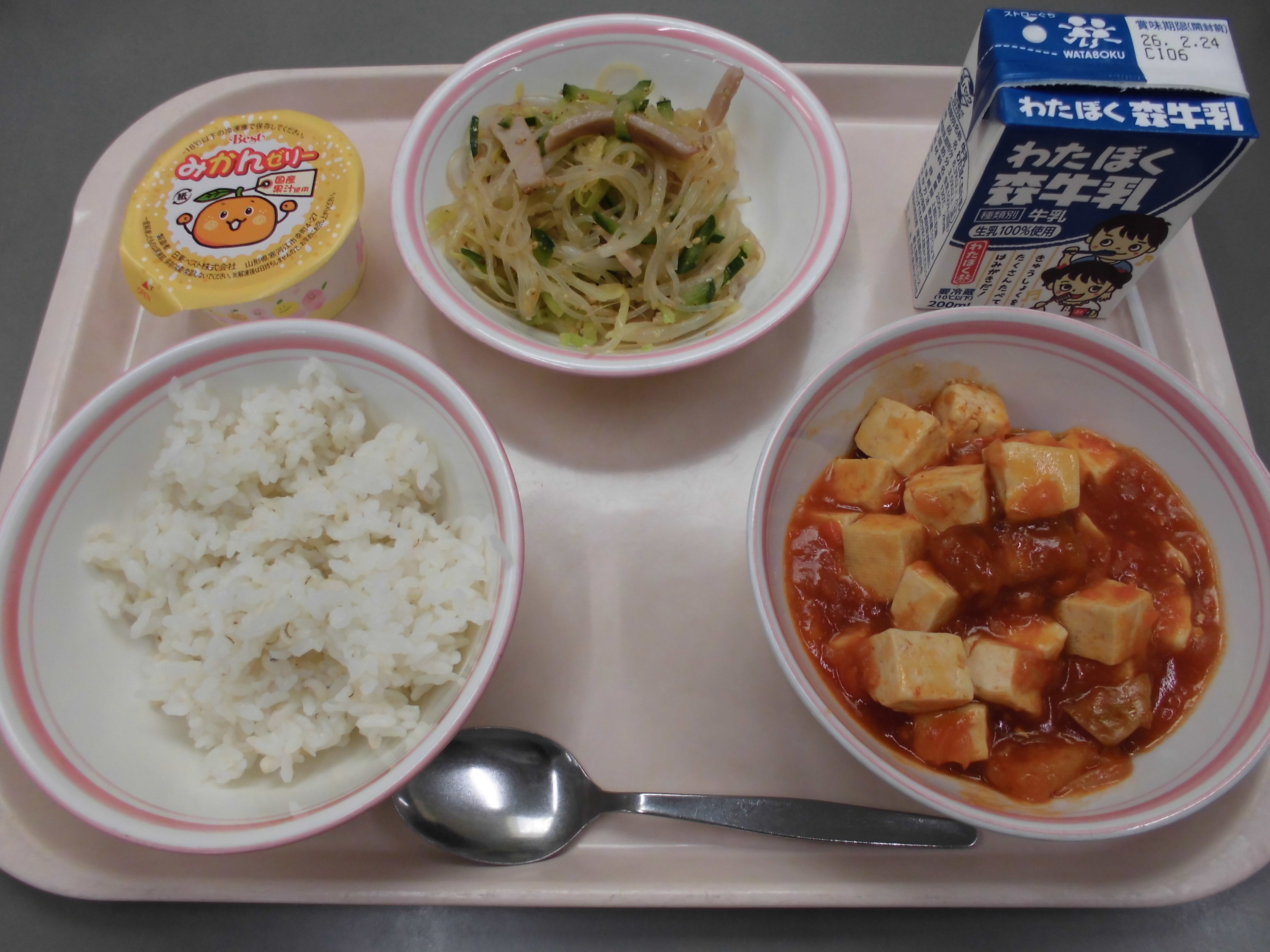 麦ご飯、いかと豆腐のチリソース、春雨サラダ、みかんゼリー、牛乳