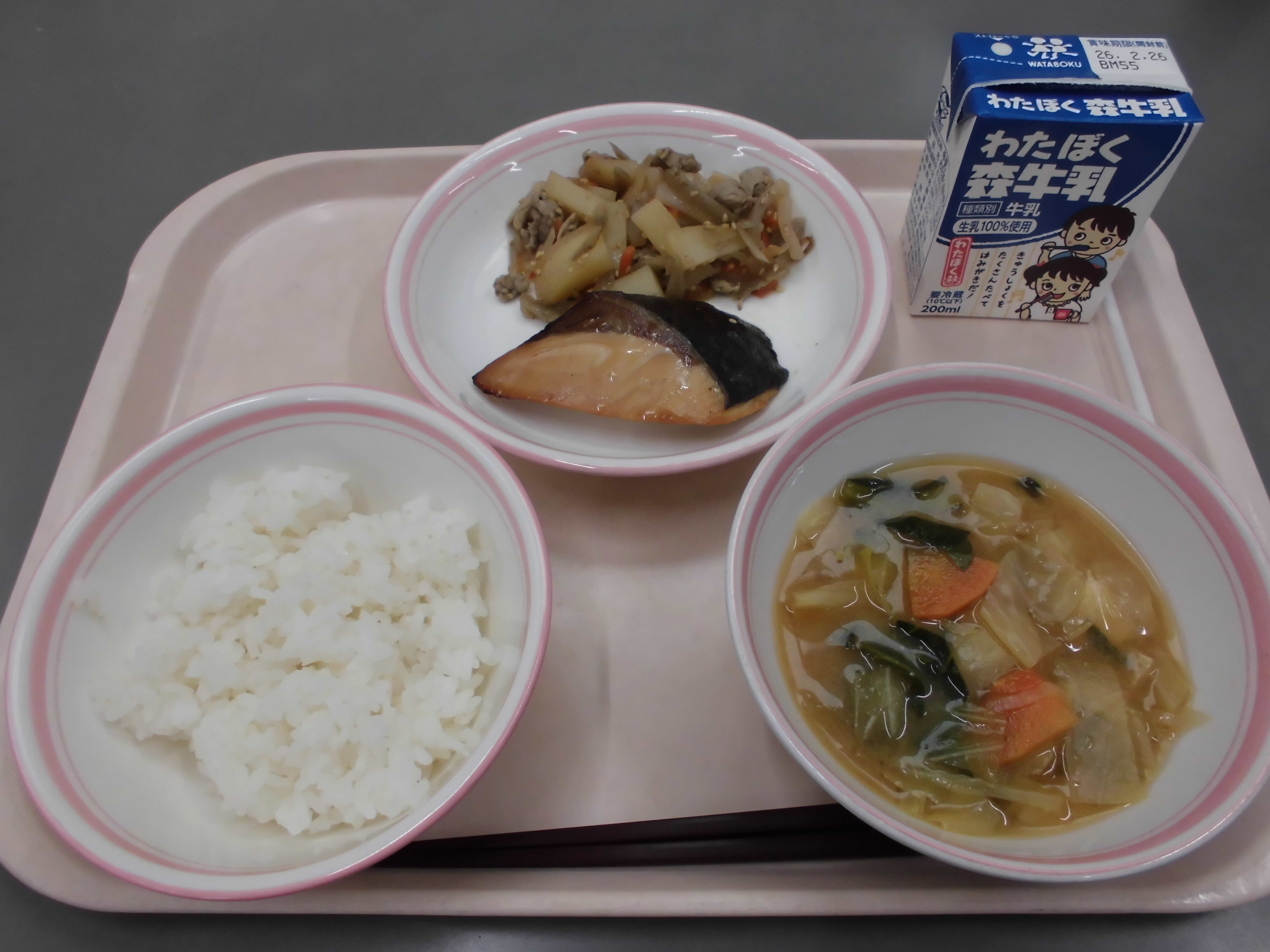 岩槻のご飯(彩のきずな)、ぶりのすだち醤油焼き、味噌汁、五目きんぴら、牛乳