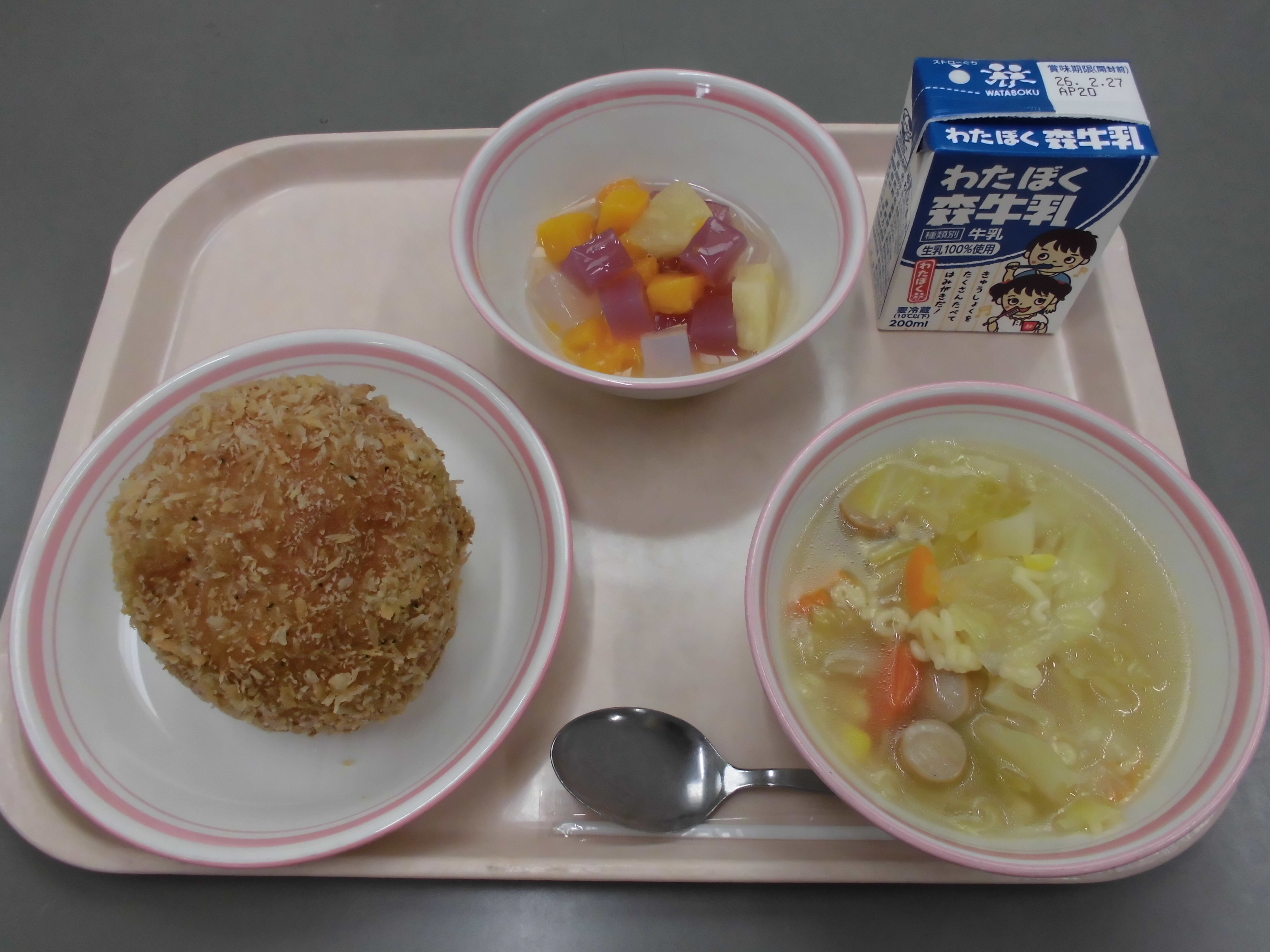 手作りカレーパン、ABC野菜スープ、フルーツミックス、牛乳