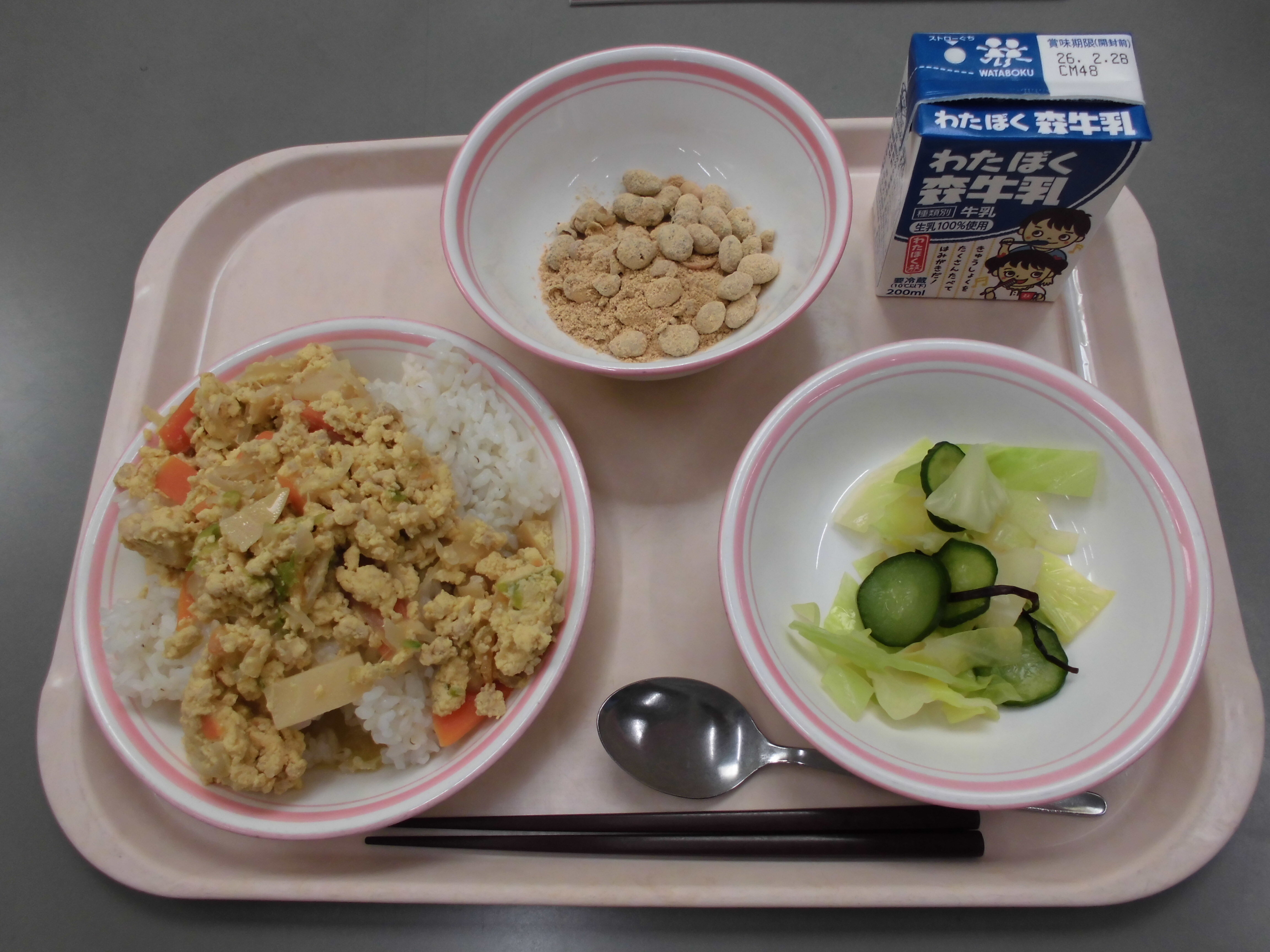 卵丼(麦ご飯)、きなこ大豆、昆布和え、牛乳