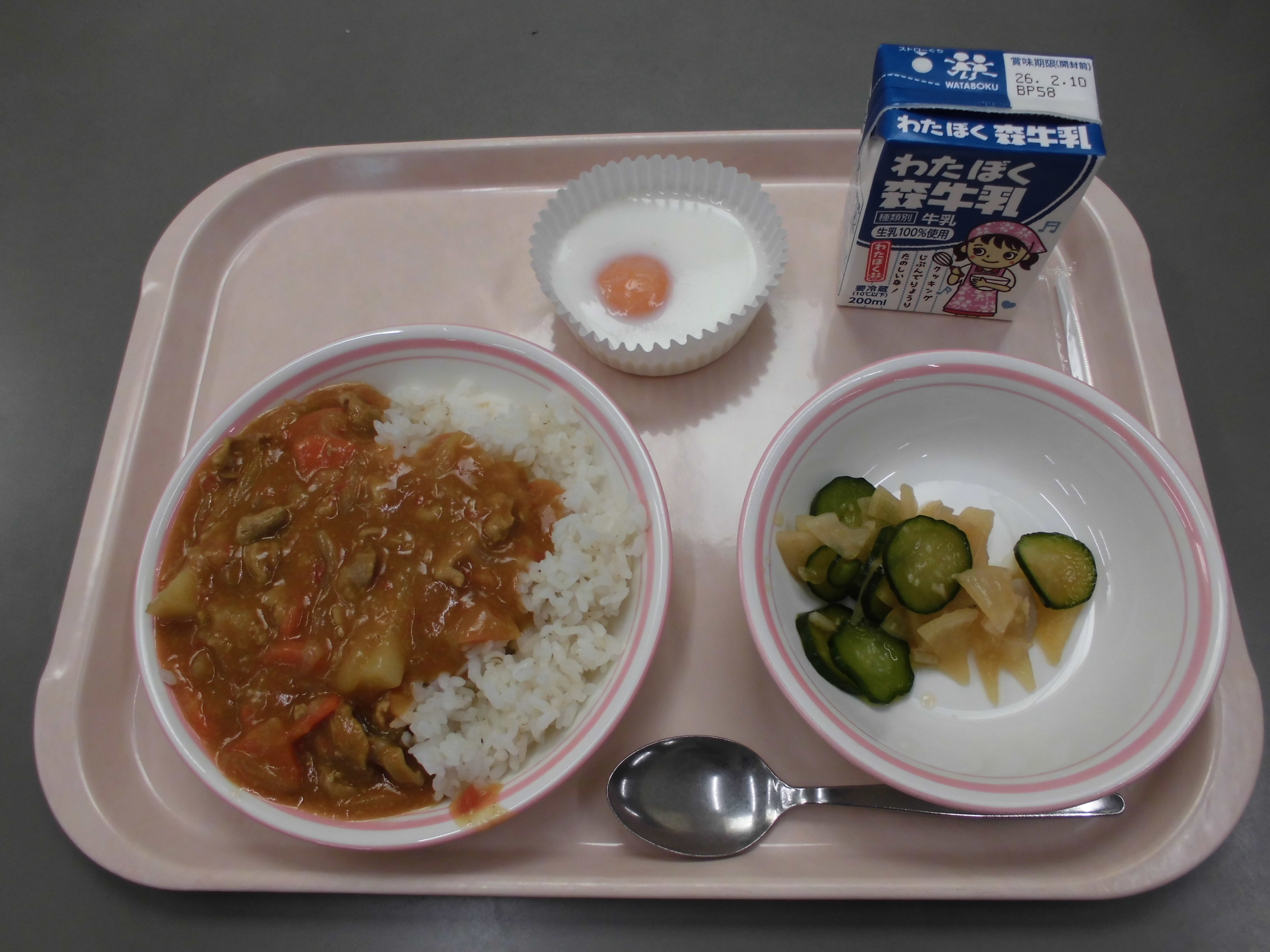 ポークカレー(麦ご飯)、手作り福神漬け、お菓子な目玉焼き、牛乳