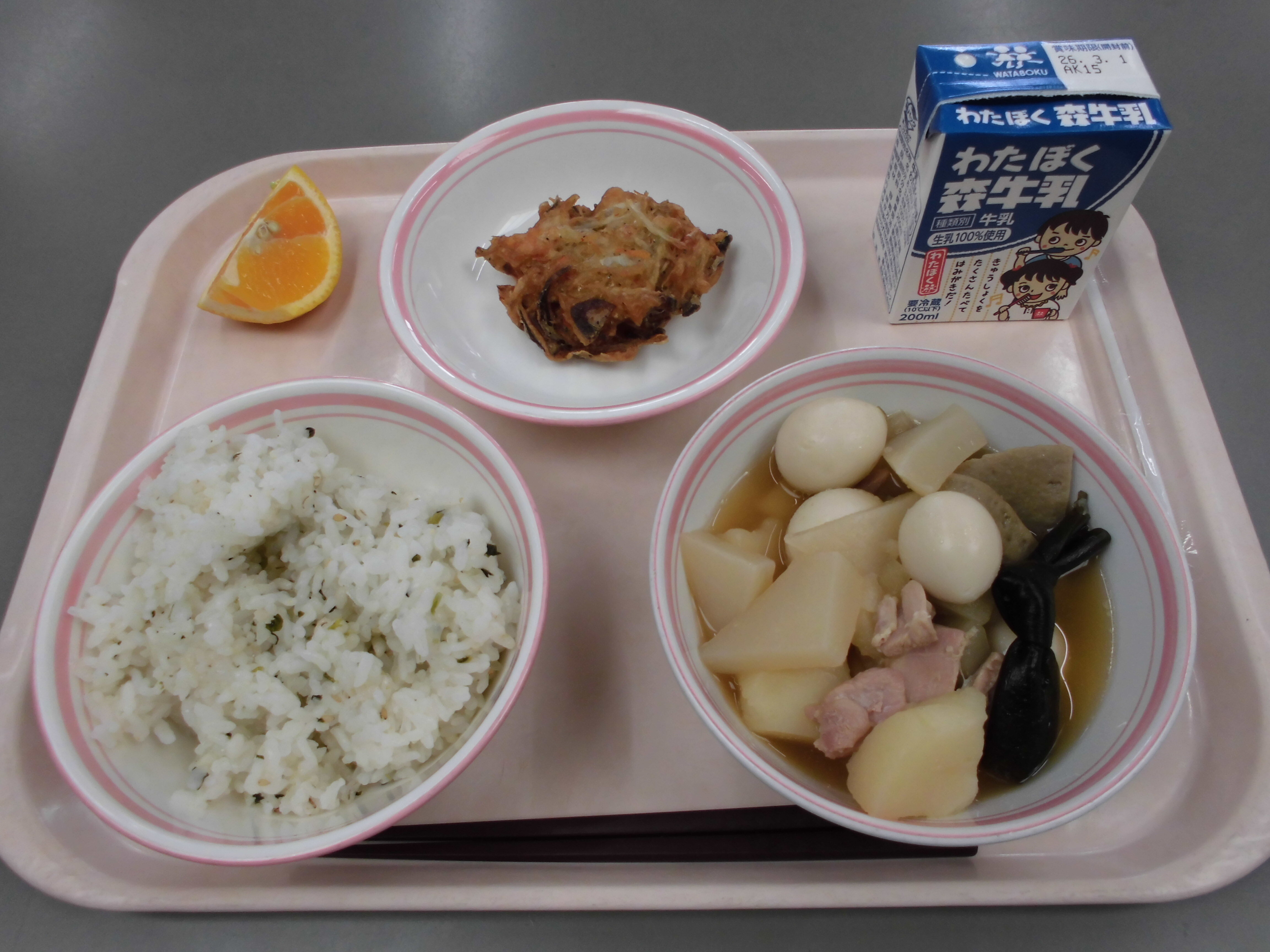 菜飯、黒はんぺん入りおでん、桜えびとしらすのかき揚げ、いずのはる、牛乳
