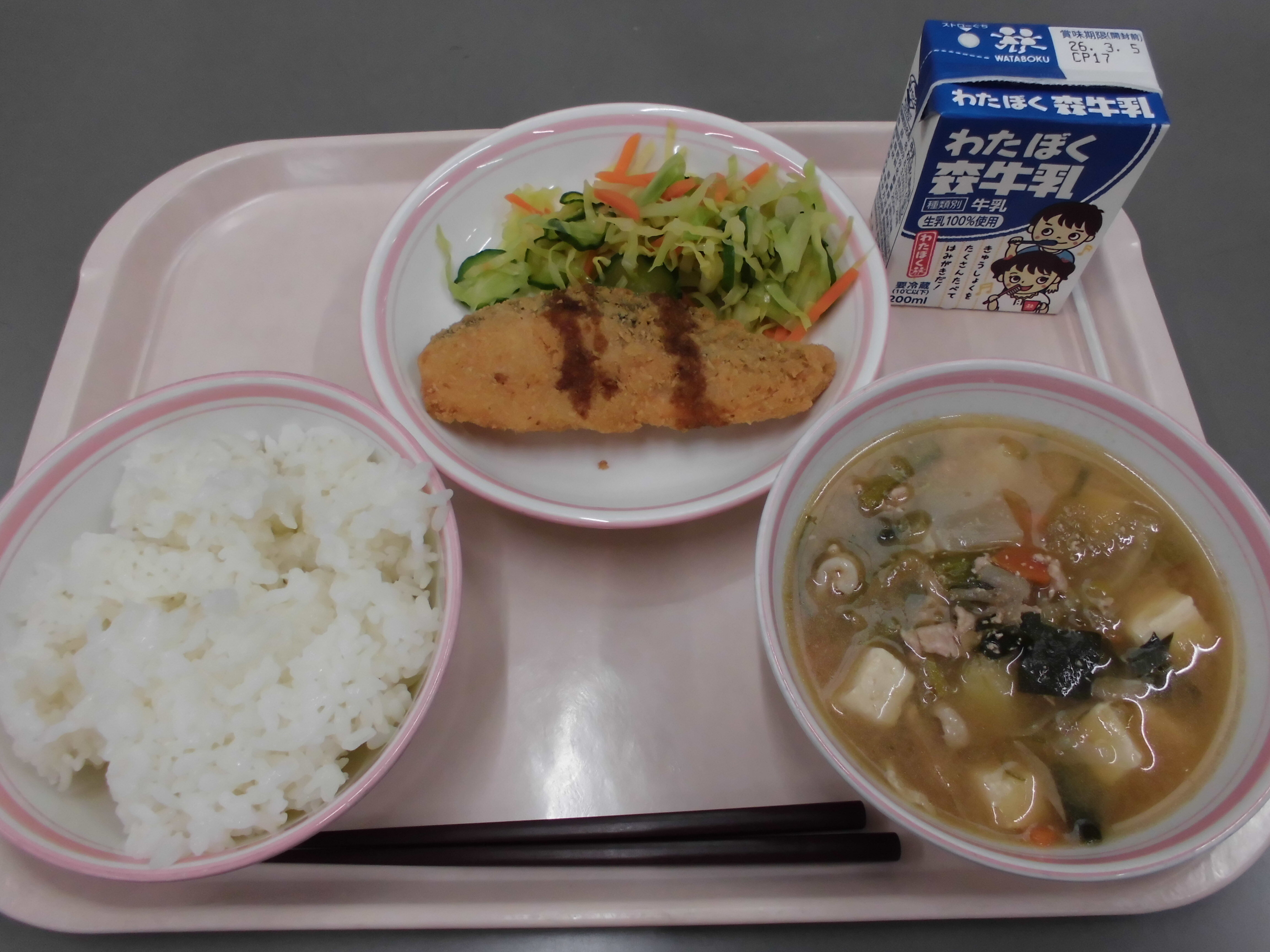 ご飯、サーモンフライ、豚汁、香り漬け、牛乳