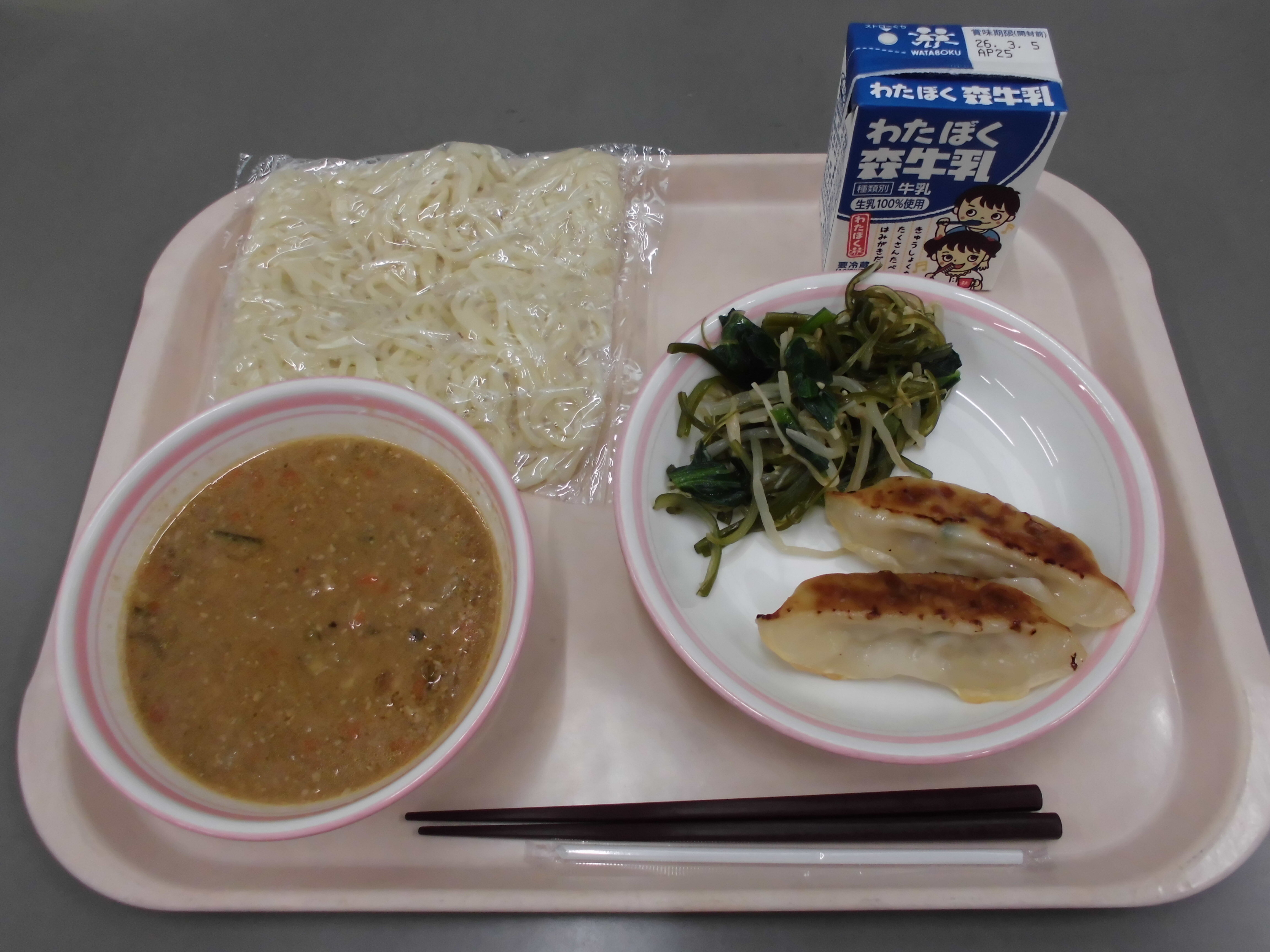担々麺(中華麺)、焼き餃子、茎わかめのサラダ、牛乳