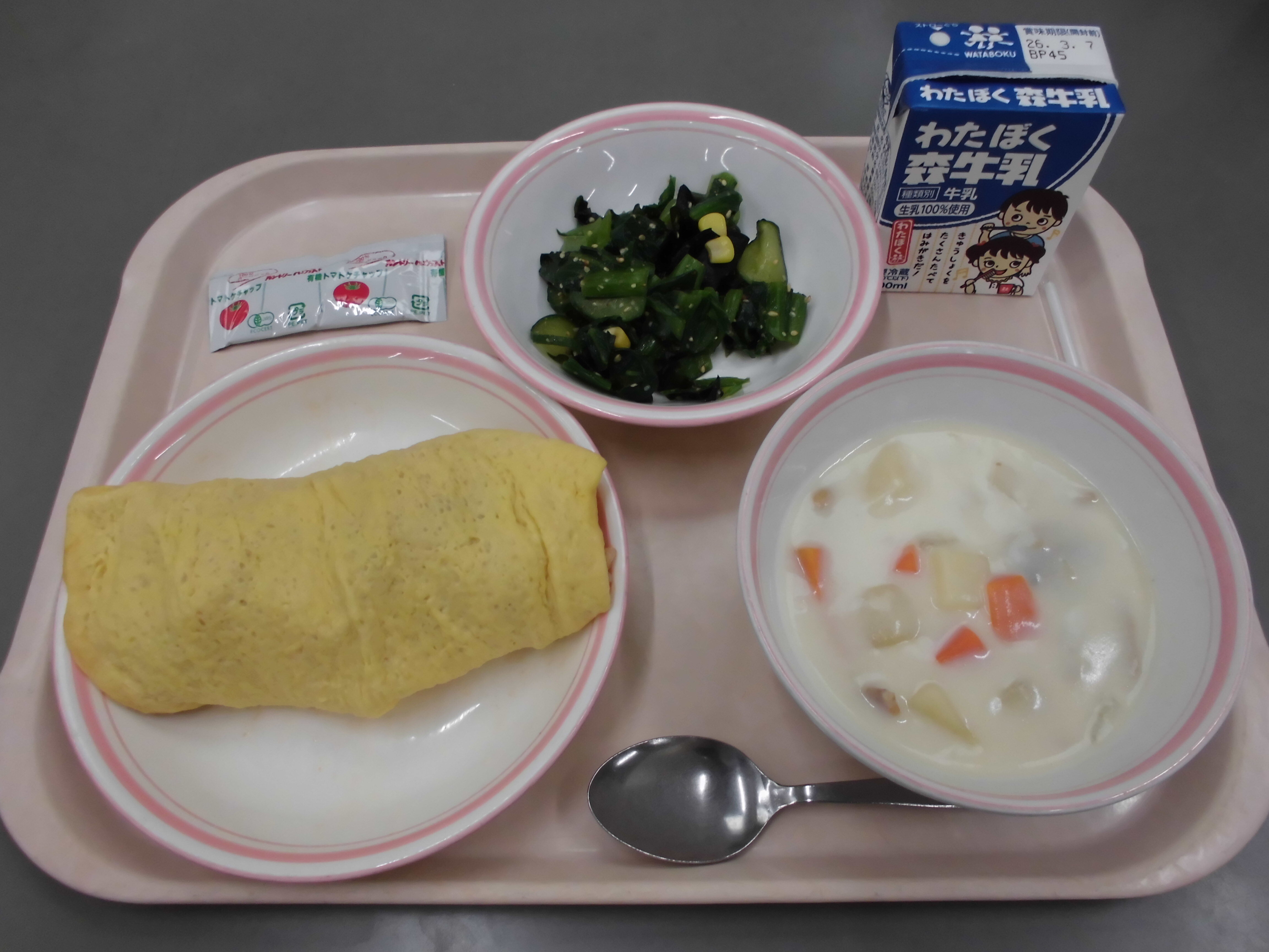 オムライス、白いんげん豆のクリームスープ、小松菜のサラダ、牛乳