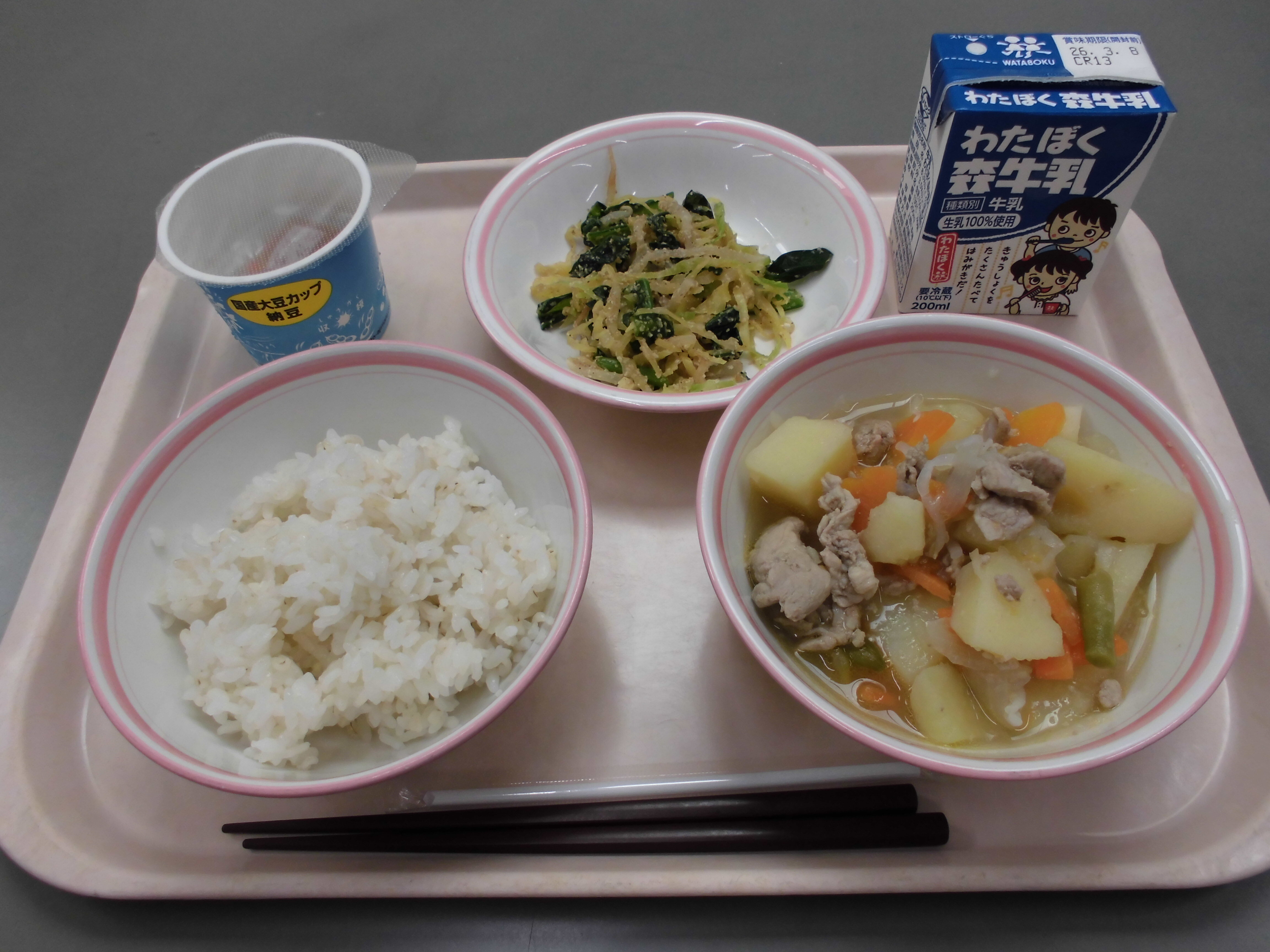 麦ご飯、納豆、旨塩肉じゃが、ごま和え、牛乳
