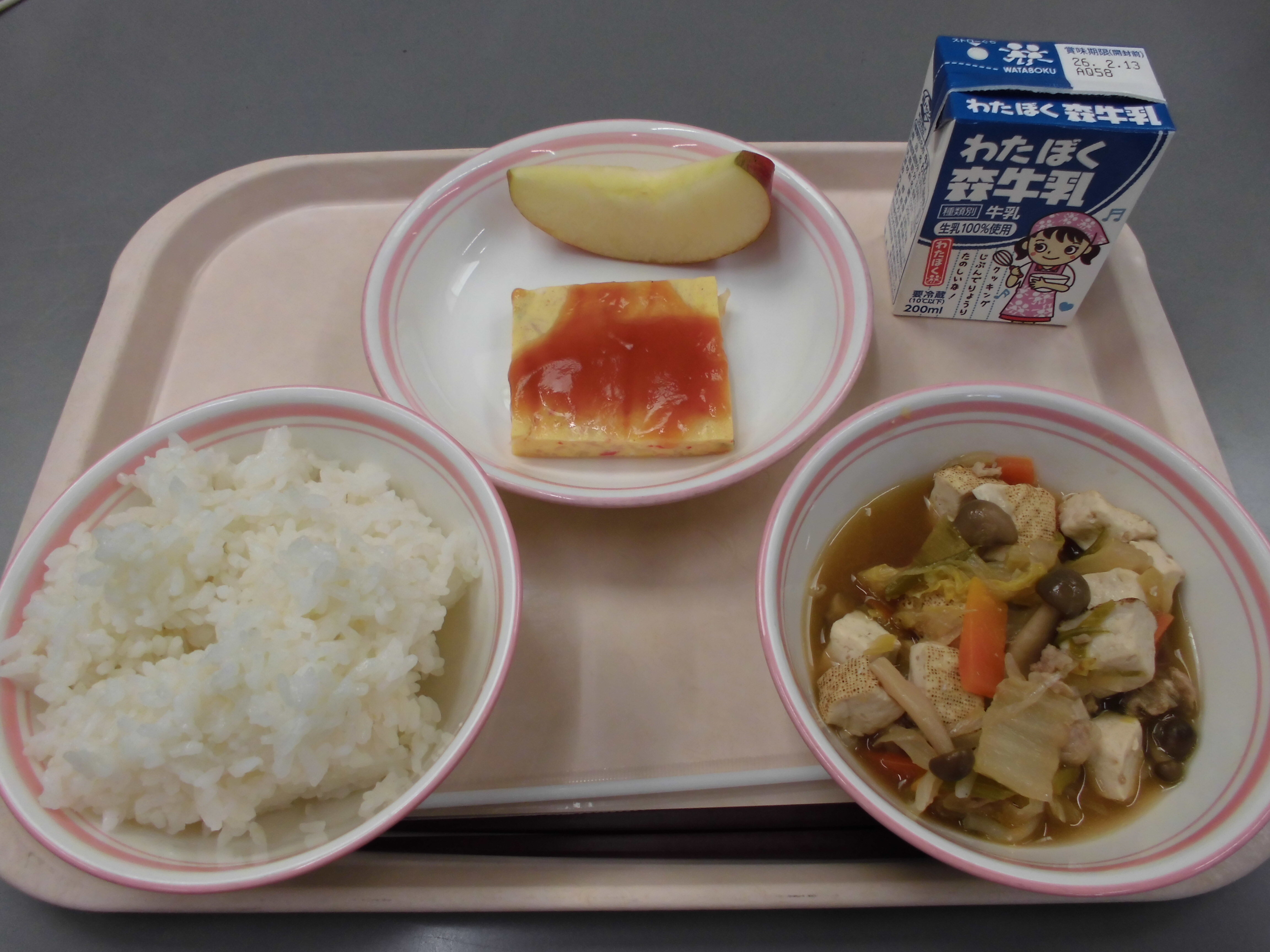 ご飯、かにかま入り卵焼き、すき焼き風煮、りんご、牛乳