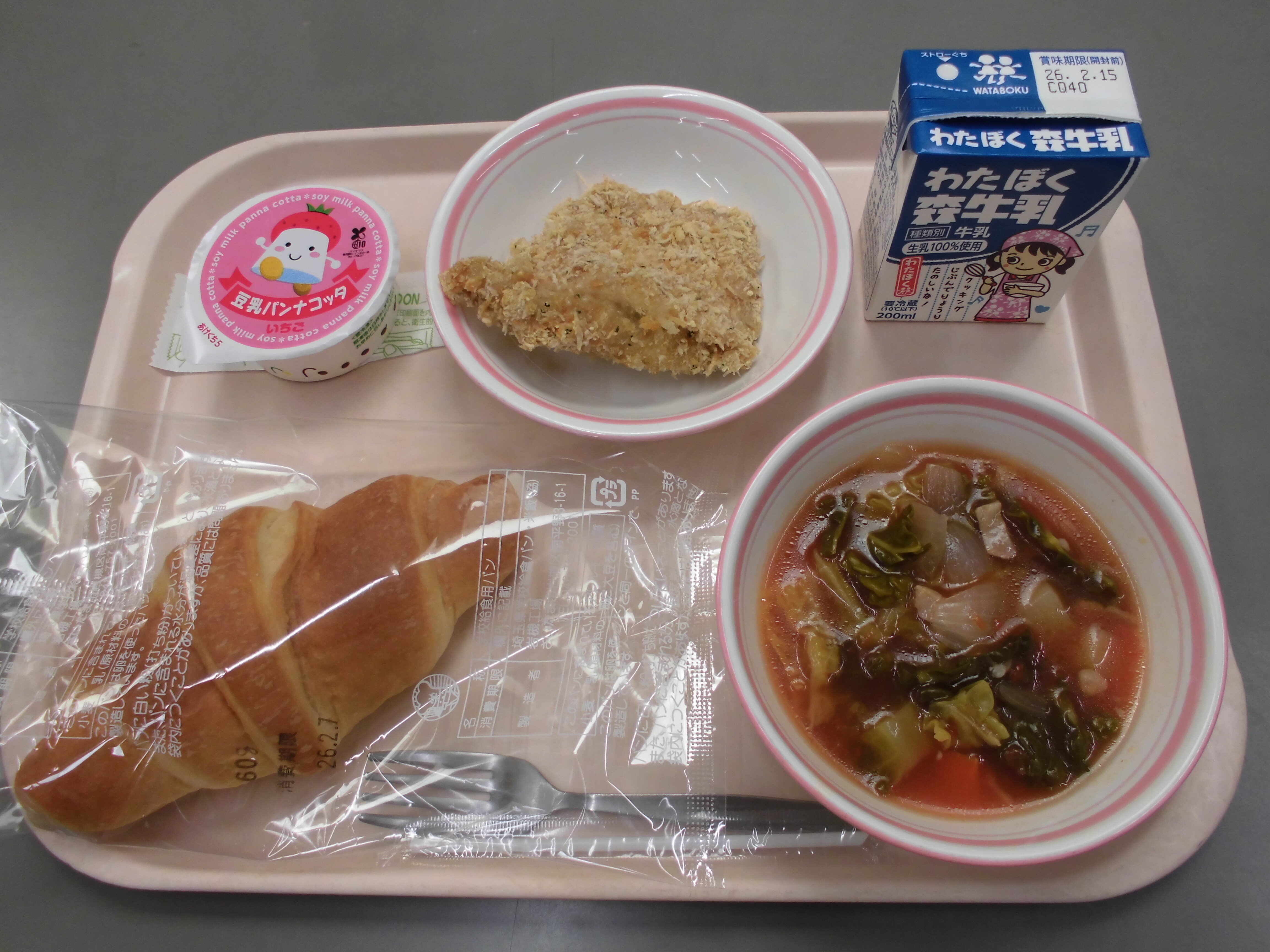 コルネット(クロワッサン)、ミラノ風チキンカツ、ヨーロッパ野菜のミネストローネ、パンナコッタ、牛乳