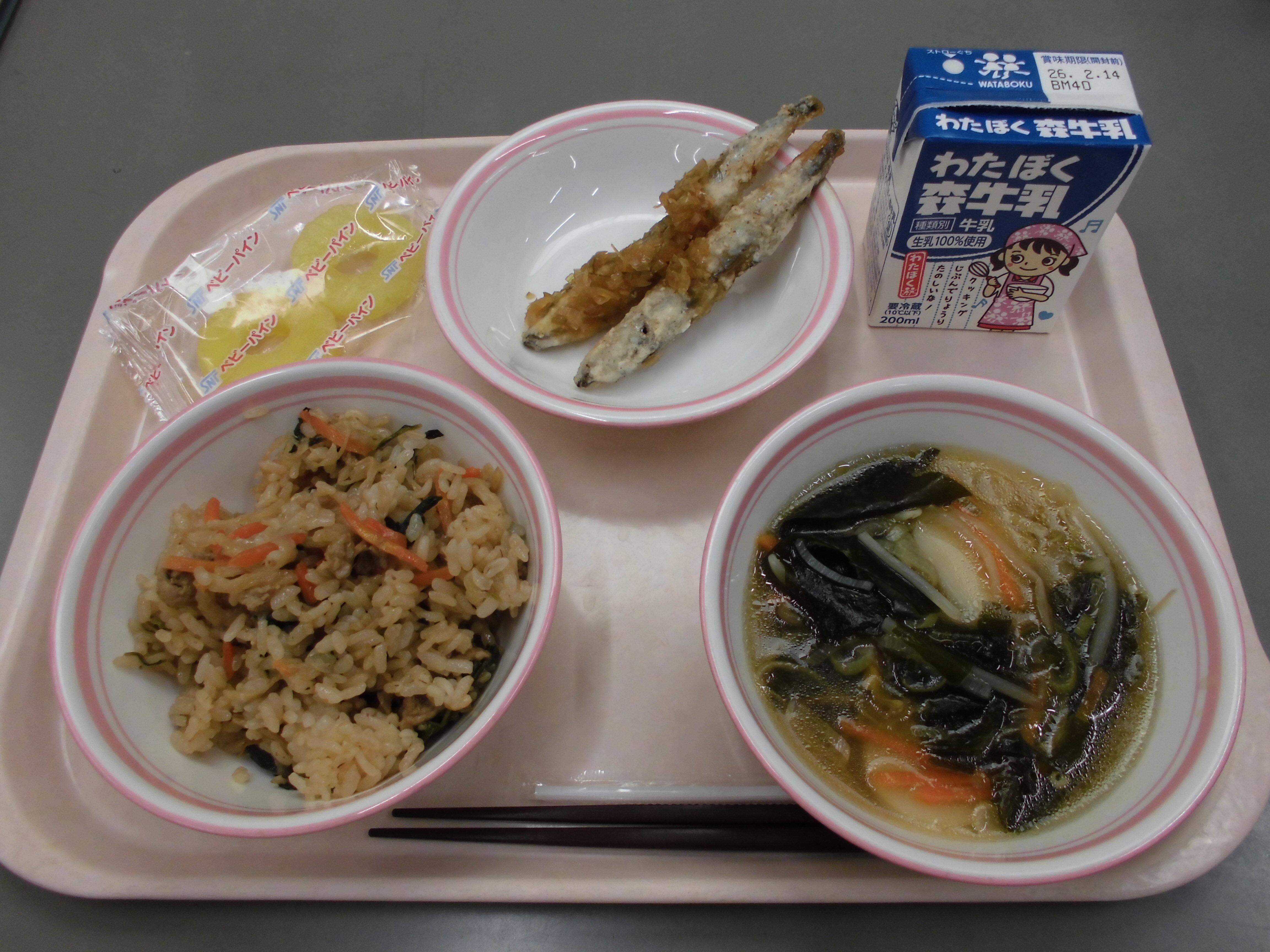 韓国風炊き込みご飯、ししゃもの南蛮漬け、トックスープ、パイナップル、牛乳